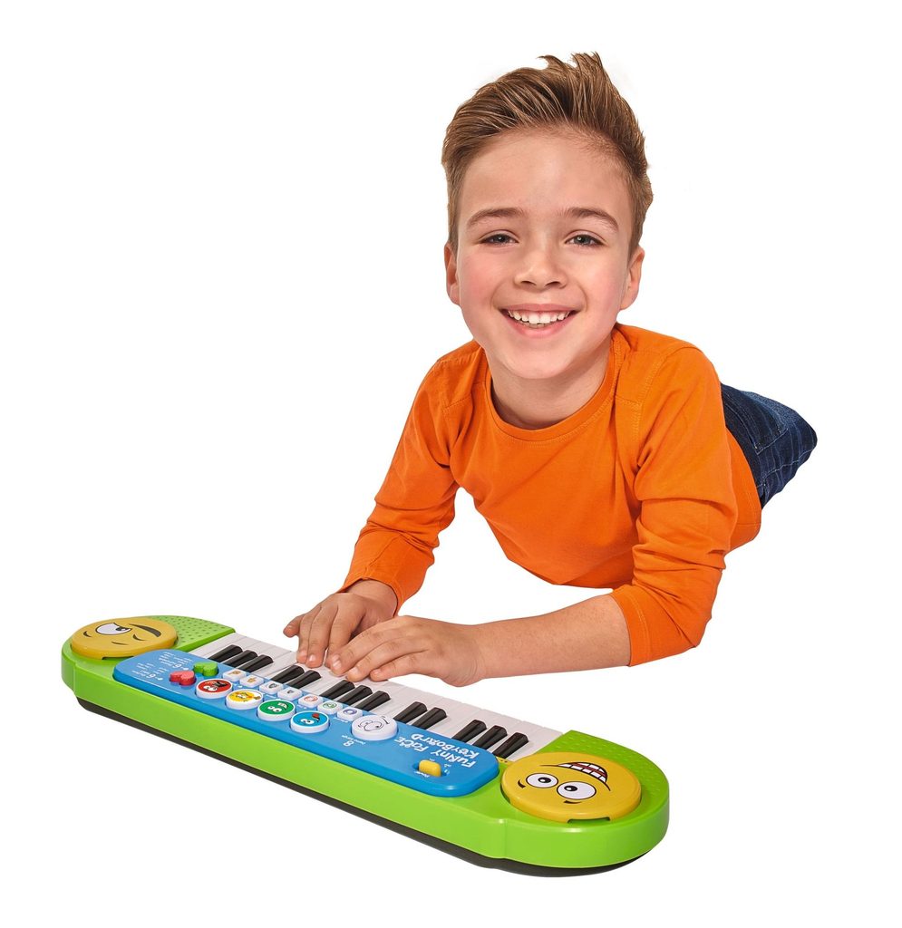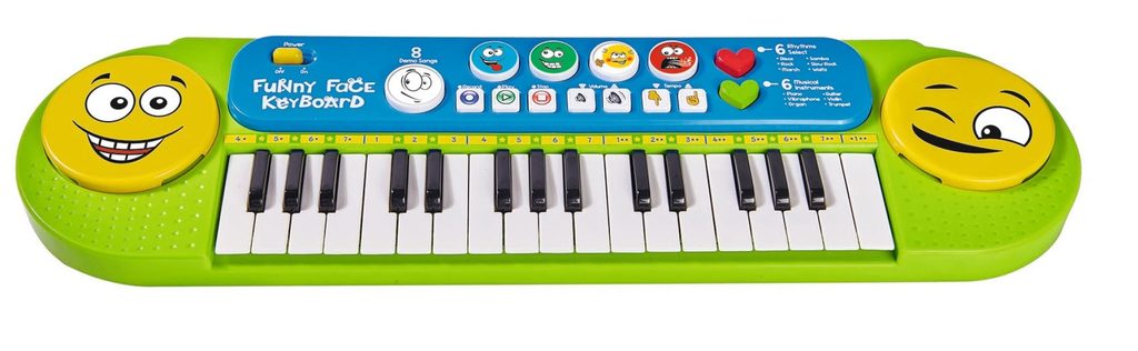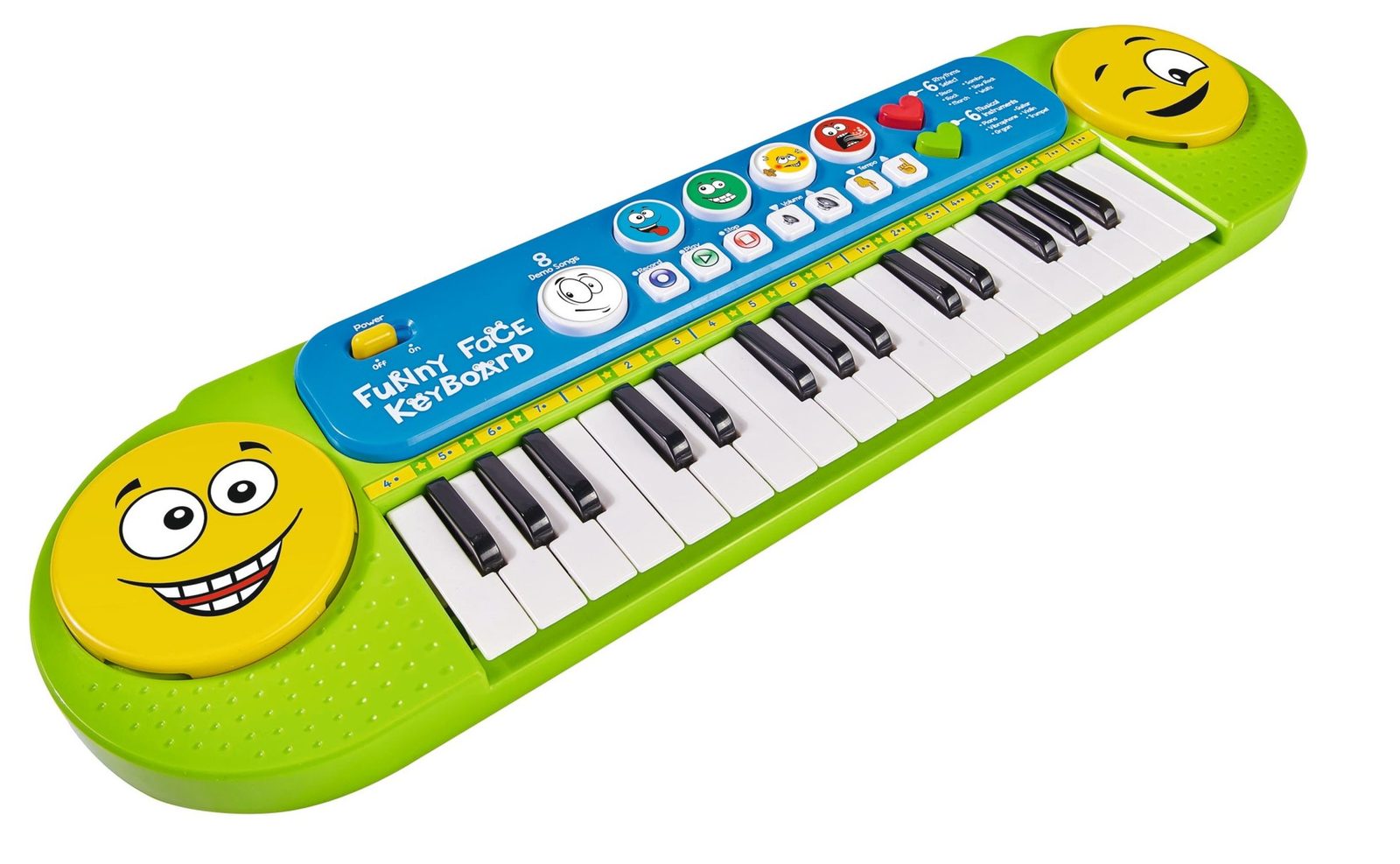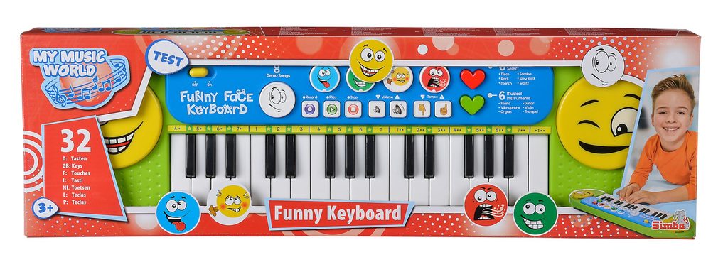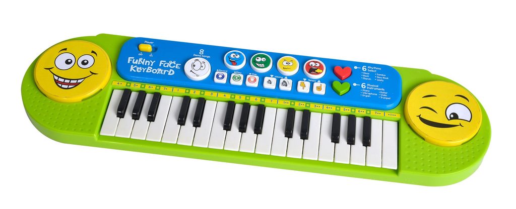 Dětské, funny klávesy mají 32 kláves, 8 demo melodií, 6 rytmů a 4 legrační zvuky. Velikost 51 x 14 cm.