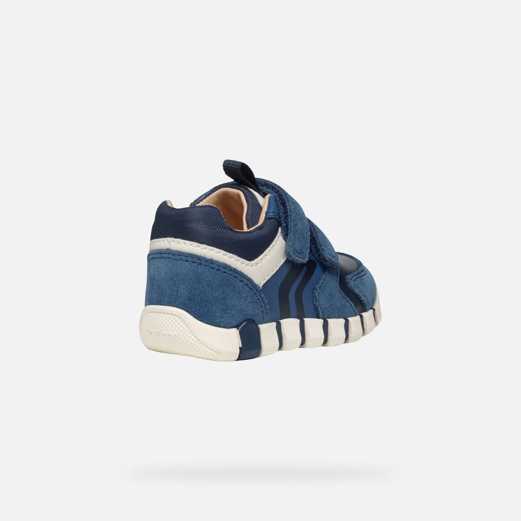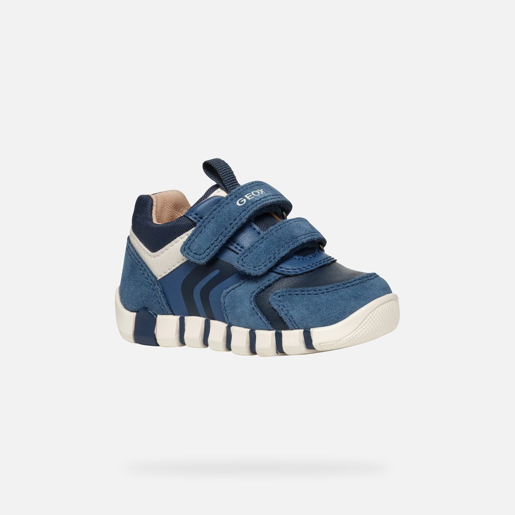 Modré chlapecké boty pro první krůčky Geox Iupidoo Boy s praktickými suchými zipy pro snadné obouvání.