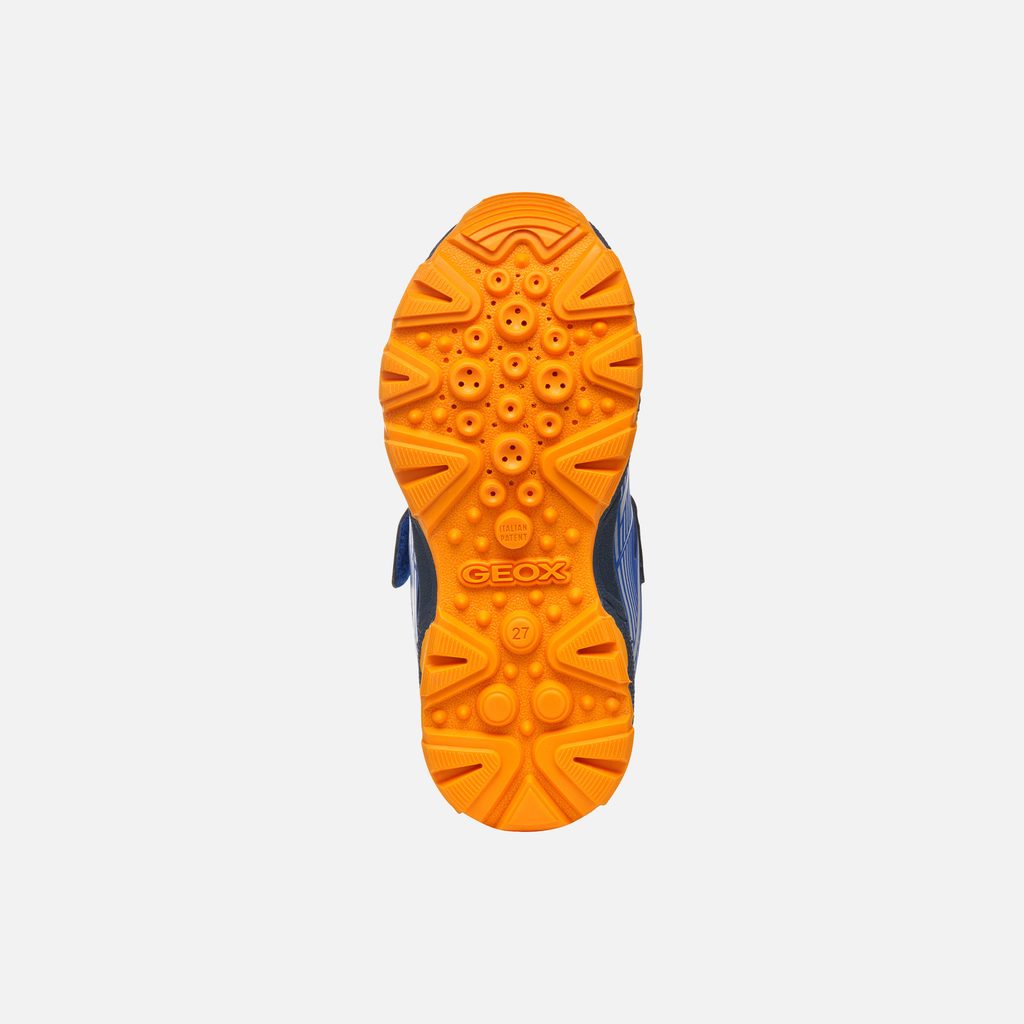 Modré chlapecké tenisky Geox Magnetar jsou stylovou volbou pro aktivní děti. Design kombinuje modrou barvu s námořnickými detaily, oranžovými akcenty na špičce, patě a podrážce, a červeno-oranžovými tkaničkami. Praktický suchý zip s logem GEOX a poutko na patě usnadňují obouvání.