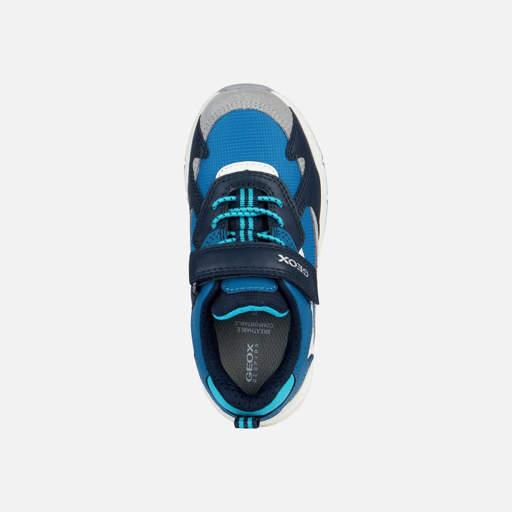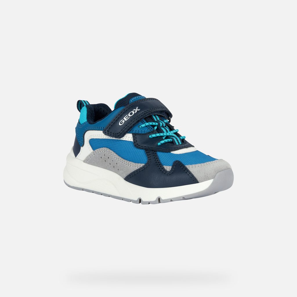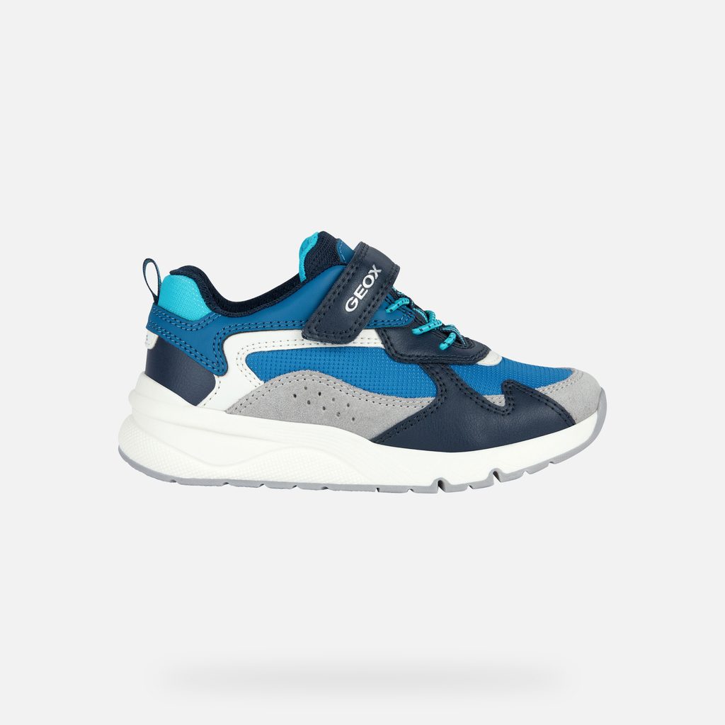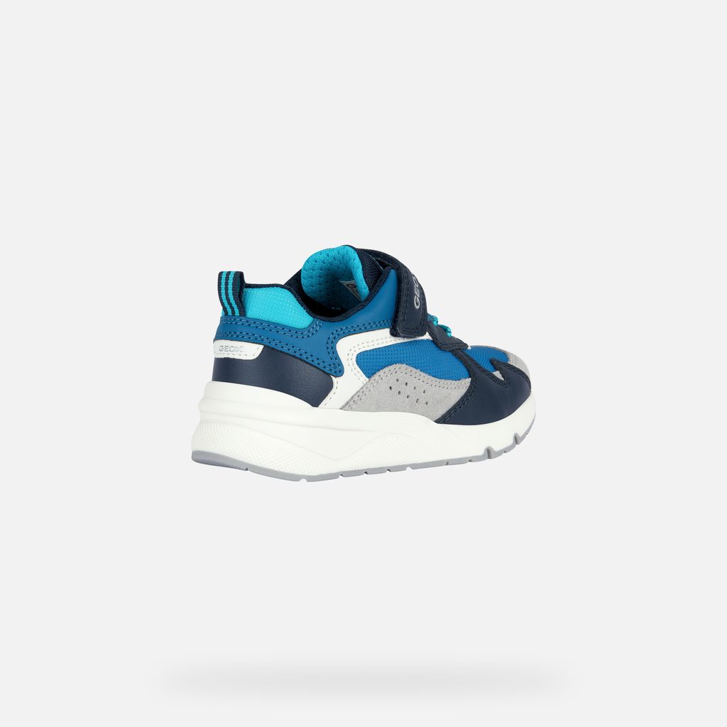Modré chlapecké tenisky Geox Rooner zaujmou svým sportovním designem v kombinaci modré, námořnicky modré a tyrkysové barvy. Vyznačují se praktickým suchým zipem s logem GEOX, tyrkysovými tkaničkami a poutkem na patě pro snadné obouvání.