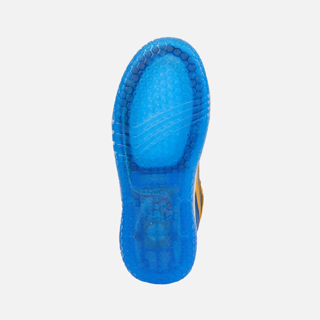 Modré svítící tenisky pro malé dobrodruhy s grafickým motivem blesku a praktickým zapínáním na suchý zip. Průsvitná modrá podešev dodává botám moderní vzhled, zatímco žluté akcenty vytváří energický kontrast.