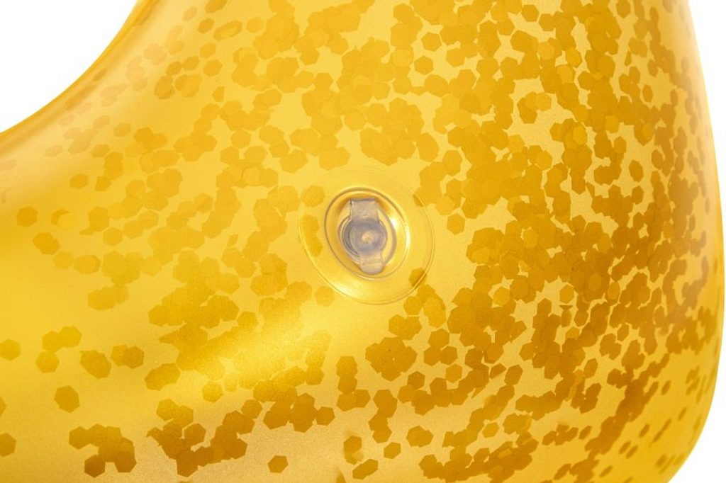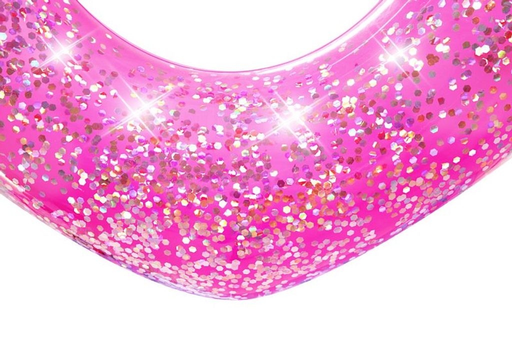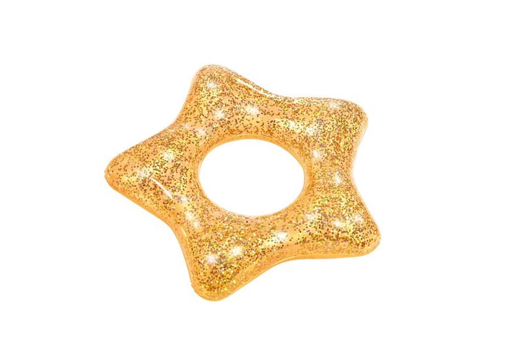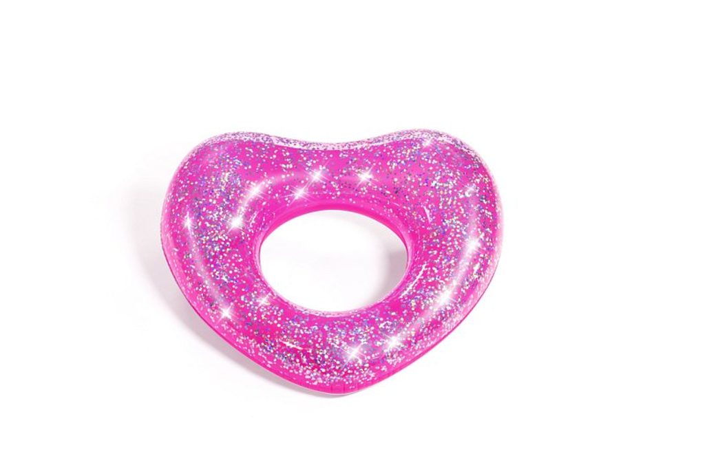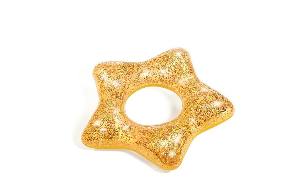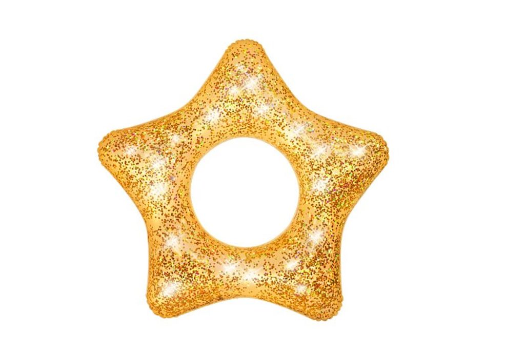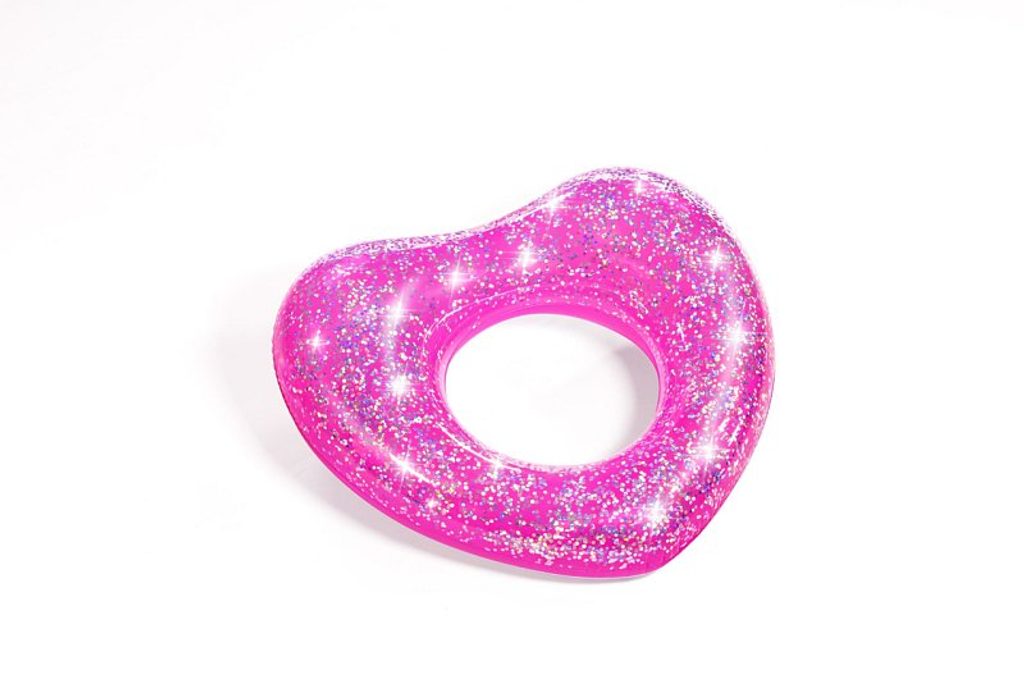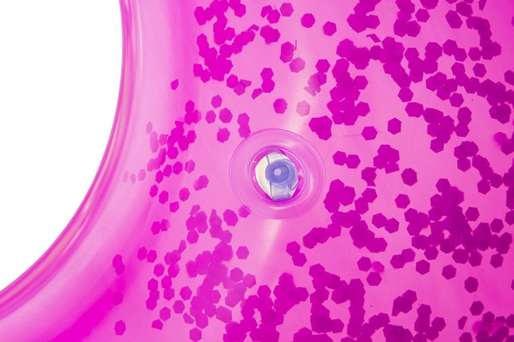 Nafukovací plážový kruh plný třpytek. Barevné třpytky v kruhu se na slunci třpytí a vytvářejí atraktivní efekty. Kruh je v provedení růžového srdce nebo zlaté hvězdy. Vyrobeno z kvalitního a odolného vinylu.