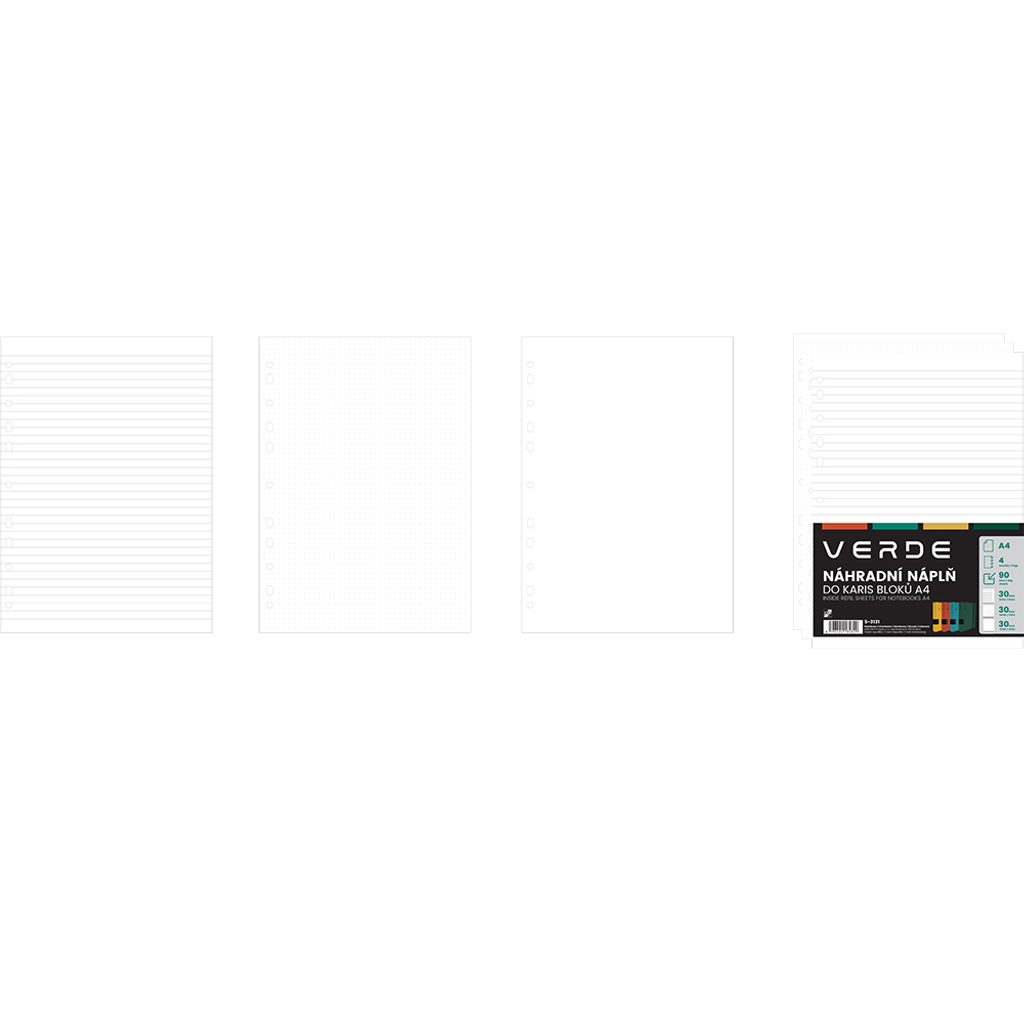 Praktické náhradní náplně do karis bloků Verde, jsou ideálním řešením pro doplnění vašeho oblíbeného zápisníku. Tento set náplní obsahuje celkem 90 stran rozdělených do tří různých typů: 30 stran s linkou o šířce 8 mm, 30 stran s tečkovaným potiskem a 30 stran bez potisku, což umožňuje širokou škálu použití od psaní poznámek až po kreslení nebo plánování. Každá náplň je vyrobena z kvalitního papíru. Náplně perfektně pasují do vašeho karis bloku, a jejich výměna je rychlá a snadná.