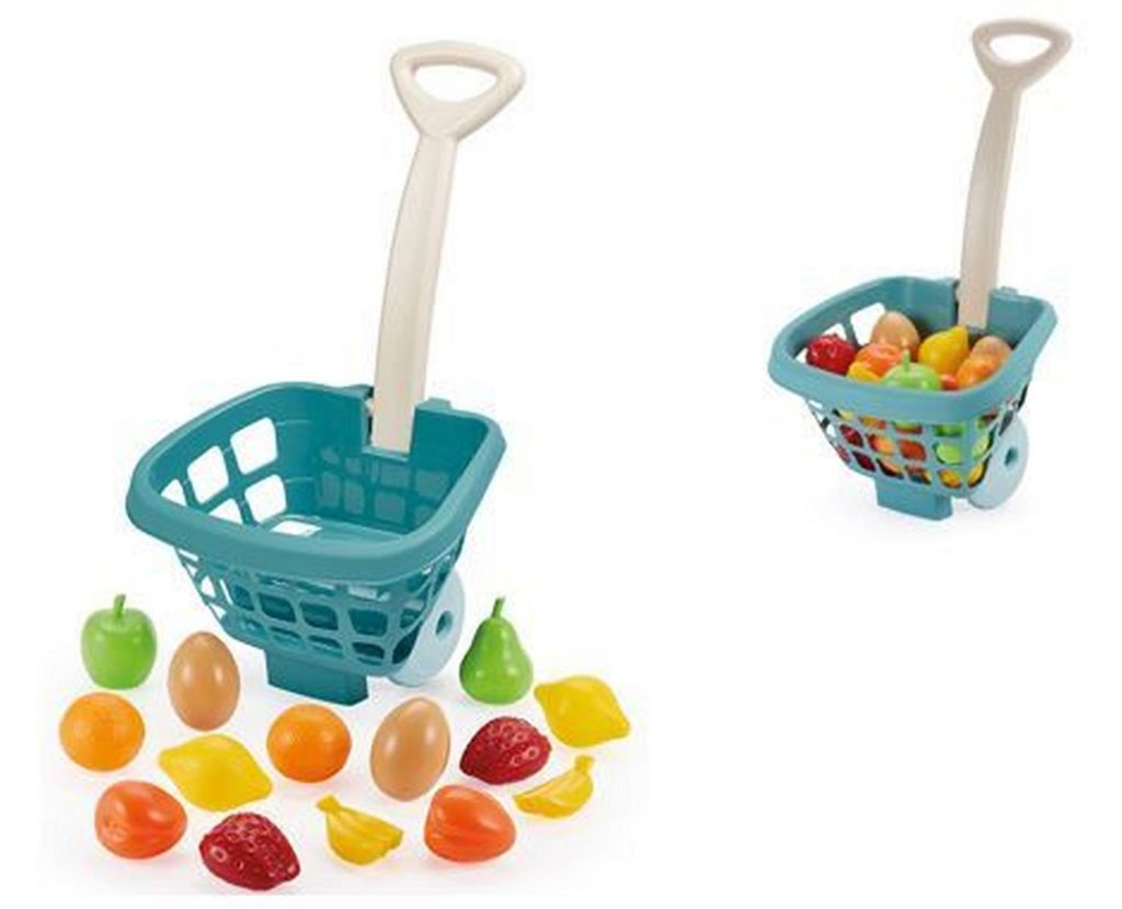Nakupní košík naplněný různými druhy ovoce a zeleniny. Nákupní košík je díky dvěma kolům a nízké hmotnosti snadno ovladatelný a vhodný pro děti od 18 měsíců. Rozměry produktu 24,5x18,5x41 cm.