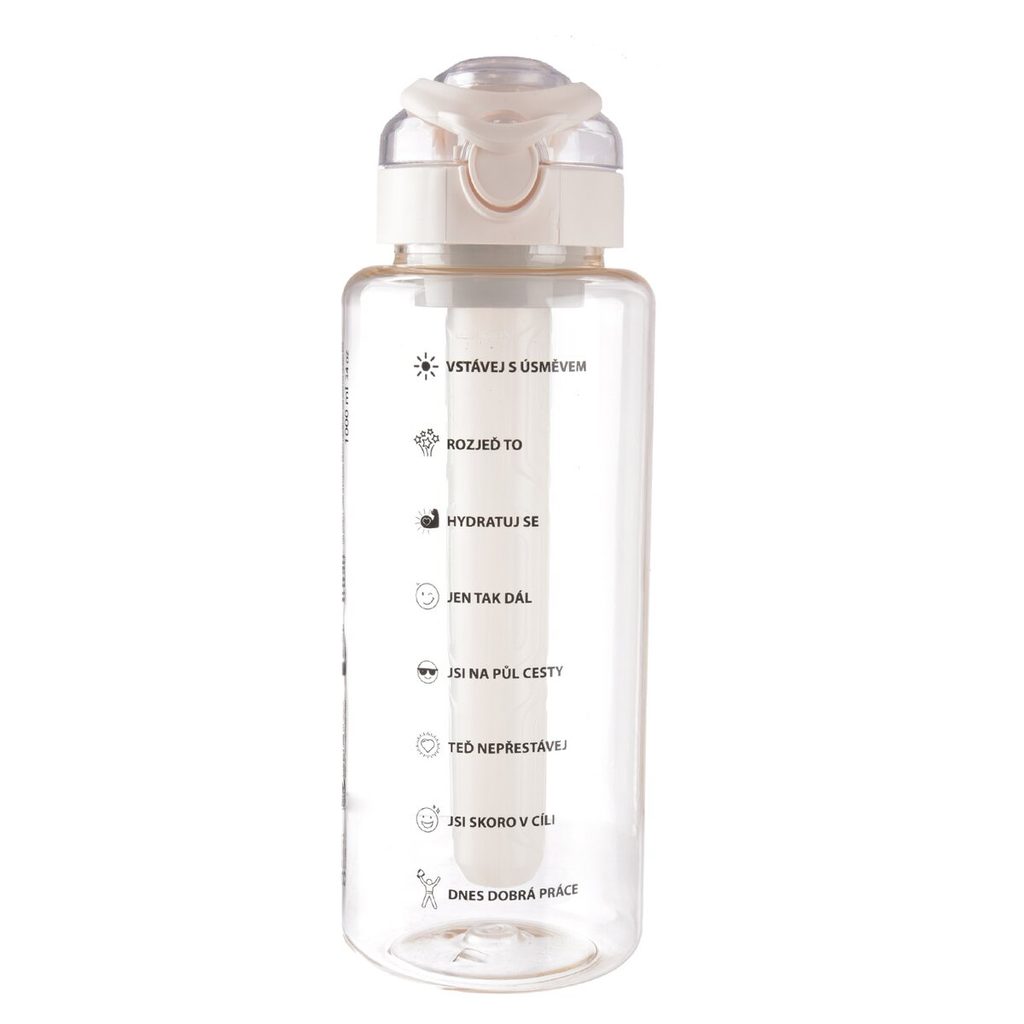 Láhev s pítkem, vkladem na led, víčkem a uchem na zavěšení je vhodná do školy, na výlet, na sport, na studené i teplé nápoje… Do vkladu vložíte led, který ochlazuje nápoj, ale neředí jej vodou z tajícího ledu. Dekor s vyznačenou motivační odměrkou vám zaručí dodržování pitného režimu. Díky ní vypijete dostatek tekutin během dne a to průběžně. Materiál: plast tritan, plast PP (infusér), silikon (těsnění). Rozměry: celkový objem 1 l, objem při využití vkladu 0,9 l, pr. 8,5 cm, v. 24 cm. Plast TRITAN nejen že neobsahuje plastifikátory, ale má i řadu jiných výhod, které z něj činí populární náhražku skla. Je vysoce odolný vůči nárazům, takže je vhodný nejen pro každodenní použití například do školy, do práce či na turistiku, obdivuhodná je jeho průhlednost a čistota materiálu, lehkost, nepřejímá žádné chutě ani vůně, vydrží nízké i vysoké teploty, může se mýt v myčce na nádobí tedy je snadná údržba, a především neobsahuje žádné zdraví škodlivé látky, odpovídá požadavkům na ochranu životního prostředí a FDA (Úřad pro kontrolu potravin a léčiv). Neobsahuje BPA – materiál Tritan neobsahuje bisfenol A, je zdravotně nezávadný, vhodný pro dětské výrobky. Křišťálově čistý – propustnost světla je větší než 90 %. Výborná rázová houževnatost – odolný proti nárazům, vysoká pevnost. Vynikající chemická odolnost – nepřejímá chutě ani vůně, může odolat pracím prostředkům, detergentům, uhlovodíkovým rozpouštědlům, olejům. Velká odolnost vůči teplotám – použití od -10 °C do +95 °C – tritan lze mýt v myčce na nádobí (bez víčka a filtru), avšak není vhodný pro použití v mikrovlnné troubě a mrazáku. Nízká váha – ideální na cesty, do školy – pro každodenní použití.