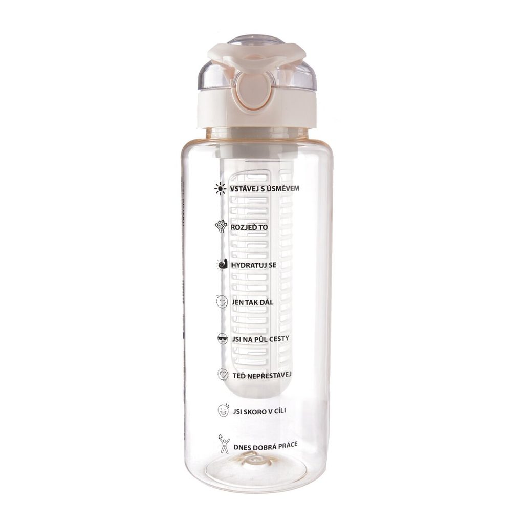 Láhev s pítkem, filtrem na ovoce a bylinky, víčkem a uchem na zavěšení. Vhodná do školy, na výlet, na sport, na studené i teplé nápoje… Do filtru můžete vložit citrusové ovoce, mátu, meduňku, okurek… Nápoj bude ochucený, osvěžující, ale pít budete čisté nápoje bez dužiny, lístků… Dekor s vyznačenou motivační odměrkou vám zaručí dodržování pitného režimu. Díky ní vypijete dostatek tekutin během dne a to průběžně. Materiál: plast tritan, plast PP (infusér), silikon (těsnění). Rozměry: celkový objem 1 l, objem při využití vkladu 0,9 l (závisí na míře naplnění infuséru, zda ovocem nebo bylinkami), pr. 8,5 cm, v. 24 cm. Plast TRITAN nejen že neobsahuje plastifikátory, ale má i řadu jiných výhod, které z něj činí populární náhražku skla. Je vysoce odolný vůči nárazům, takže je vhodný nejen pro každodenní použití například do školy, do práce či na turistiku, obdivuhodná je jeho průhlednost a čistota materiálu, lehkost, nepřejímá žádné chutě ani vůně, vydrží nízké i vysoké teploty, může se mýt v myčce na nádobí tedy je snadná údržba, a především neobsahuje žádné zdraví škodlivé látky, odpovídá požadavkům na ochranu životního prostředí a FDA (Úřad pro kontrolu potravin a léčiv). Neobsahuje BPA – materiál Tritan neobsahuje bisfenol A, je zdravotně nezávadný, vhodný pro dětské výrobky. Křišťálově čistý – propustnost světla je větší než 90 %. Výborná rázová houževnatost – odolný proti nárazům, vysoká pevnost. Vynikající chemická odolnost – nepřejímá chutě ani vůně, může odolat pracím prostředkům, detergentům, uhlovodíkovým rozpouštědlům, olejům. Velká odolnost vůči teplotám – použití od -10 °C do +95 °C – tritan lze mýt v myčce na nádobí (bez víčka a filtru), avšak není vhodný pro použití v mikrovlnné troubě a mrazáku. Nízká váha – ideální na cesty, do školy – pro každodenní použití.