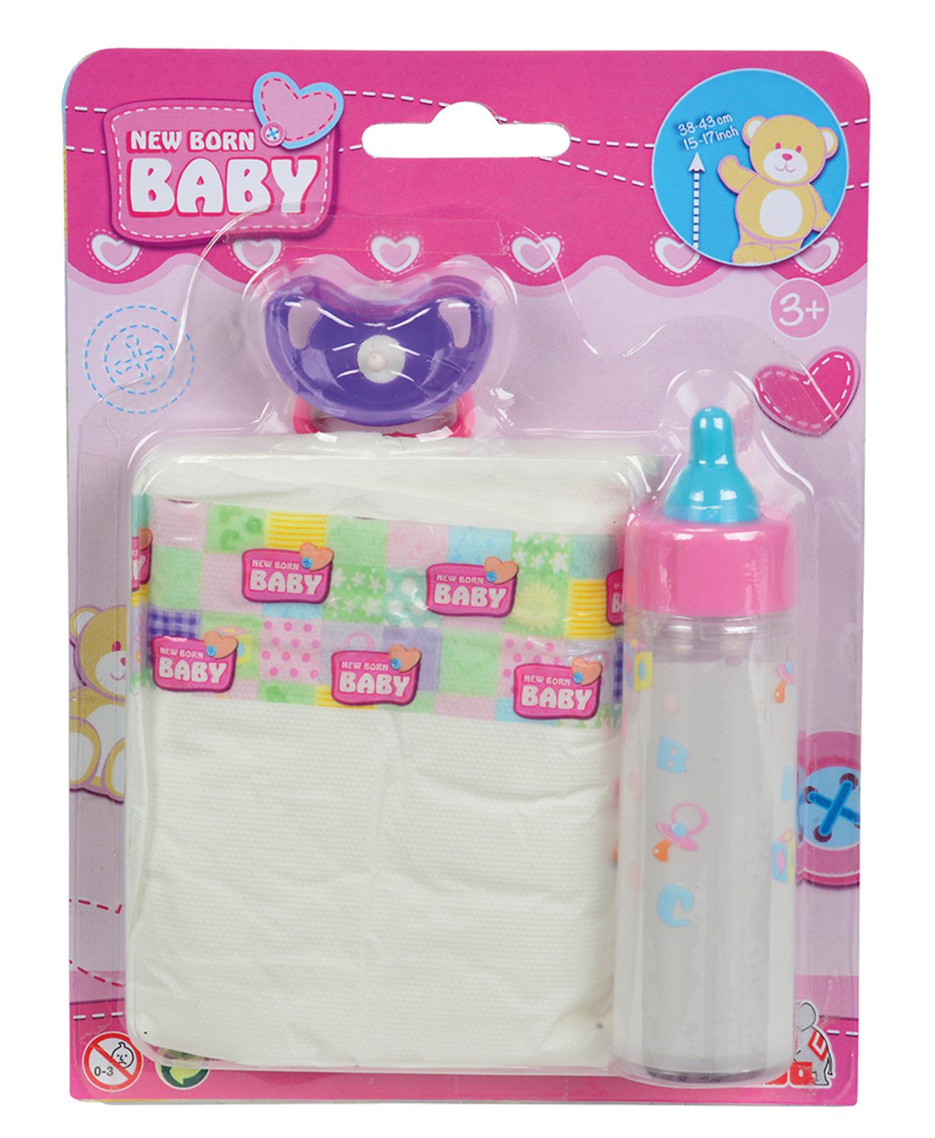 Sada pro miminka z řady New Born Baby obsahuje dudlík, plenu a lahvičku s mlékem (mizející efekt při pití). Vhodné pro panenky velikosti 38 - 43 cm.