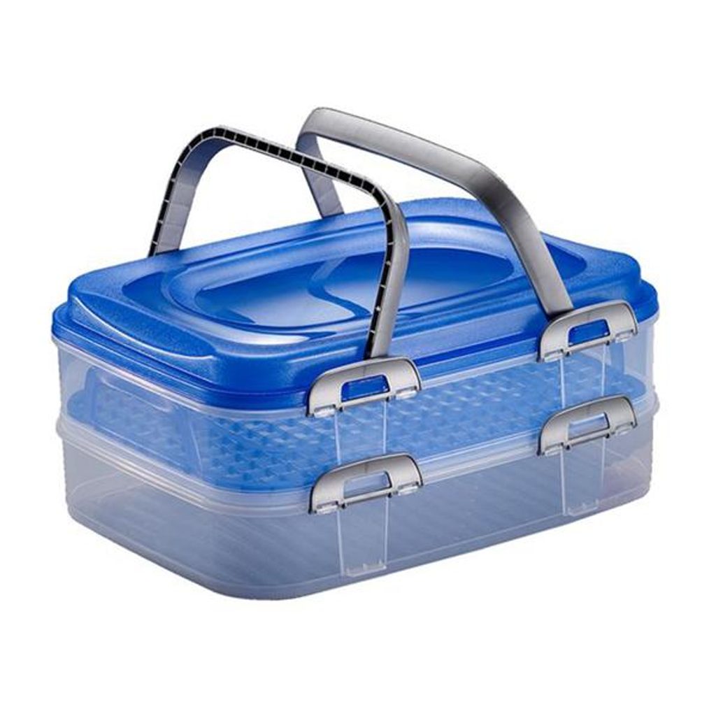 Piknikový box - 2patrový. Součástí každé sestavy je 1 mřížka s uchy pro snadné vyjímání obsahu boxu. Víko je opatřeno dvěma držadly pro pohodlné nošení, boxy jsou spojeny pevnými klipsy. Rozměry vnější v cm : 40 x 30 výška 18. Materiál pevný plast - Polypropylen.