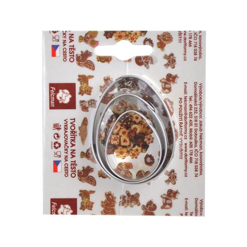 Velikonoční vykrajovátka na cukroví ve tvaru vajíček. Vykrajovátka jsou vyrobená z pocínovaného plechu. Vykrajovátka jsou od českého výrobce a splňují všechny předepsané normy. Balení 3 ks různých velikostí vajíček: 4,1 x 5,7cm, 3,5 x 4,7cm a 2,8 x 3,7cm VYKRAJOVAČKA VAJÍČKA MALÁ, POCÍNOVANÁ