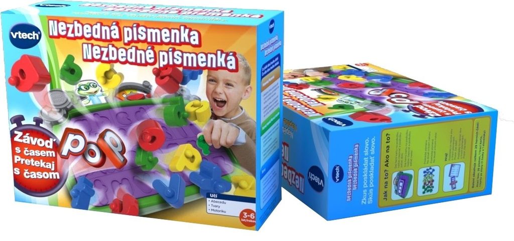 Nezbedná písmenka – dovednostní hra pro děti od 3 let prověří postřeh, logické myšlení i manuální zručnost! Nezbedná písmenka od VTECH! Vhodná pro jednoho, ale i více hráčů. Ti nejmenší se podvědomě učí správné tvary písmen a ti větší, už můžou skládat i jednoduchá slova! Pozor! Běží čas! Zatlačte hrací podložku, stiskněte tlačítko časomíry do polohy START pro spuštění časovače, a poté začněte skládat písmenka na svá místa, tak rychle, jak můžete! Když stihnete poskládat všechna písmena dřív, než čas vyprší, stiskněte tlačítko STOP. Pokud to nestihnete, podložka vyskočí a písmenka se vysypou. Úroveň náročnosti: Hra je rozdělena podle délky času a výběru barev. Ke hře použijte všechna písmena. Stavitel slov I. 1. Položte Herní kartu do zarážek na podložce. 2. Podle Karty se slovy umístěte písmena na Herní kartu a hláskujte. 3. Různým nastavením času si zvyšujte náročnost. Stavitel slov II. 1. Položte Herní kartu do zarážek na podložce. 2. Ve zvoleném čase vytvořte co nejvíce slov. 3. Použitá písmena dávejte stranou, ale můžete je znovu použít v dalším slově. 4. Hráči si nastaví vždy stejně dlouhý čas a vyhrává ten, kdo získá nejvíc písmen. Bomba (Pro více hráčů) 1. Podle počtu hráčů si rozlosujte písmenka. Kdo si vylosuje písmeno A bude začínat hru.