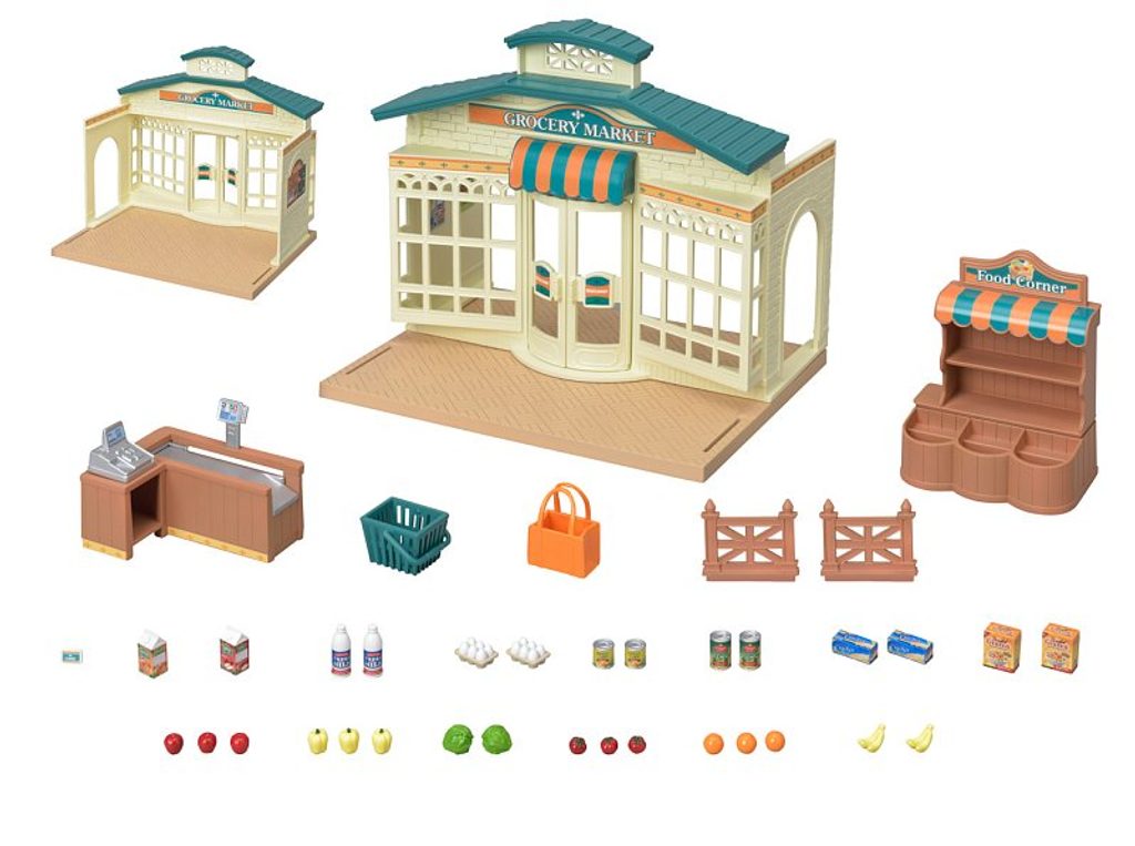 Obchod s potravinami s cihlovou zdí a zelenou střechou. Obchod je vybaven pokladním pultem s funkčním prodejním pásem a regálem s mnoha produkty. Produkty můžete umístit do prodejního regálu a nakupování může začít! Nesmí chybět nákupní košík. Vybrané zboží umístěte na prodejní pás u pokladny a pomocí posuvné páčky rozpohybujte pás a nákup se přesune do nákupního košíku. Jak snadné! Nakupování je velká zábava. Podlaha a stěny obchodu lze připevnit dvojím způsobem - uvnitř nebo vně obchodu. Tím změníte dispozici prodejny a můžete si užívat více zábavy. Obchod s potravinami má stejnou velikost podlahy jako Patrový dům s červenou střechou (5302, prodává se samostatně). Pospojováním domečků získáte nové možnosti k hraní. Nezapomeňte na Základní patrový dům (5242, prodává se samostatně). Produkt obsahuje: podlahu, která lze umístit uvnitř nebo vně obchodu, 2 stěny, které můžete též umístit uvnitř nebo vně obchodu, prodejní regál, prodejní pult s pokladnou, skenerem a funkčním prodejním pásem, nákupní košík, nákupní tašku, nákupní kartu, 2x vejce, 2x malé konzervy, 2x mléko, jablečný džus, pomerančový džus, 2x sušenky, 2x cereálie, 3 jablka, 3 papriky, 2x hlávkový salát, 3 rajčata, 2 banány a 3 pomeranče. Figurky nejsou součástí produktu. Věk: 3+.