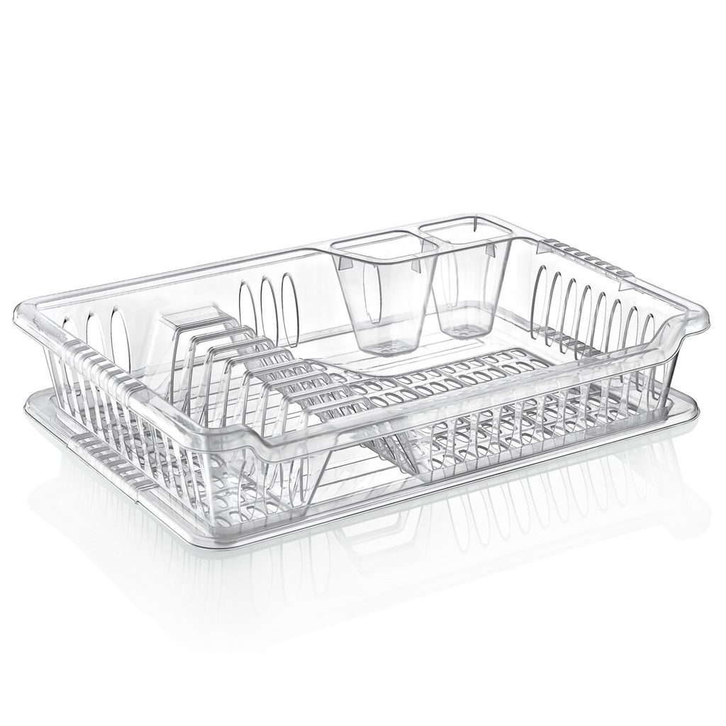 Odkapávač na nádobí transparentní s tácem. Členěný - sekce na příbory, talíře a na ostatní nádobí. Materiál: plast. Rozměr: 40x29 cm, v. 8,5 cm.
