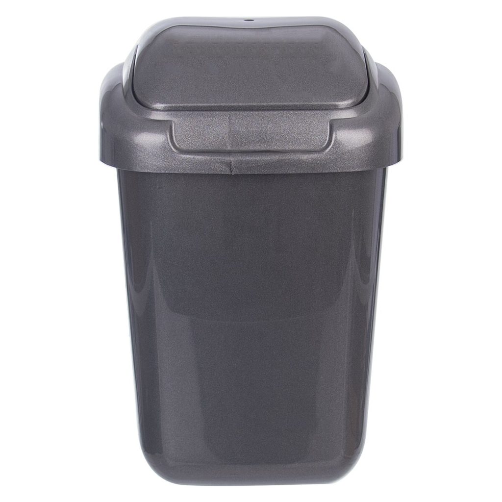 Koš odpadkový s mechanismem kolíbky ve víku. Materiál: plast. Rozměry: objem 50 l, 39x33x66 cm.