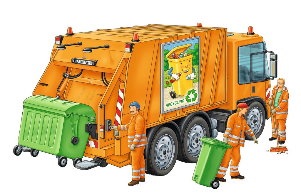 Deskové puzzle s motivem Odvozu odpadu. Složený obrázek má velikost 32,5 x 24,5 cm. Obrázek je složen z 35 dílků.