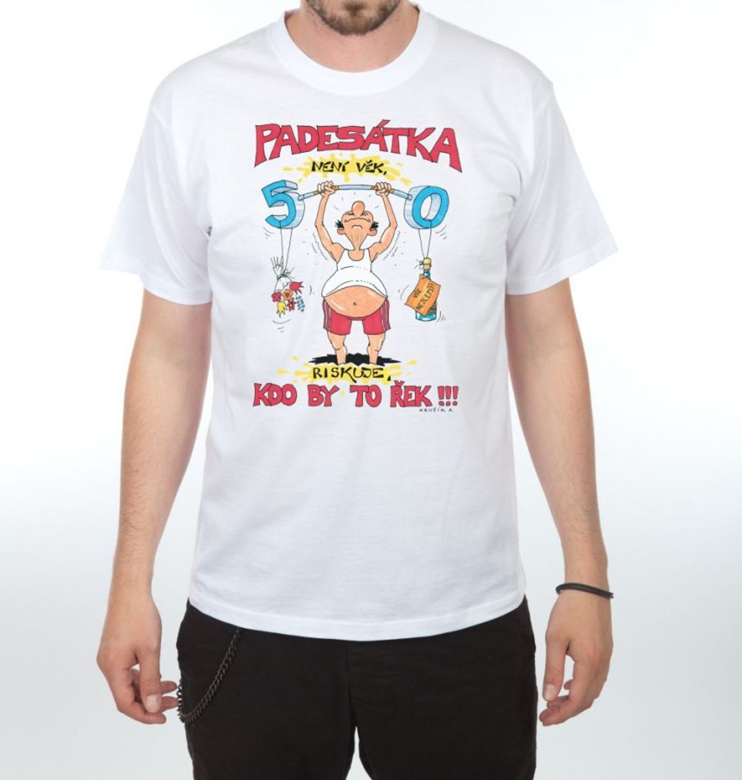 Žertovné tričko pro oslavence 50. narozenin s nápisem "Padesátka není věk, riskuje kdo by to řek". Perfektní dárek, který oslavenec tohoto životního výročí může nosit hned na narozeninové oslavě a také kdykoliv později. Praktický dárek se hodí pouze pro oslavence, který má smysl pro humor.