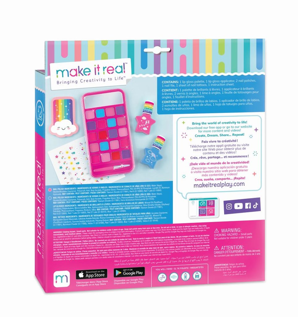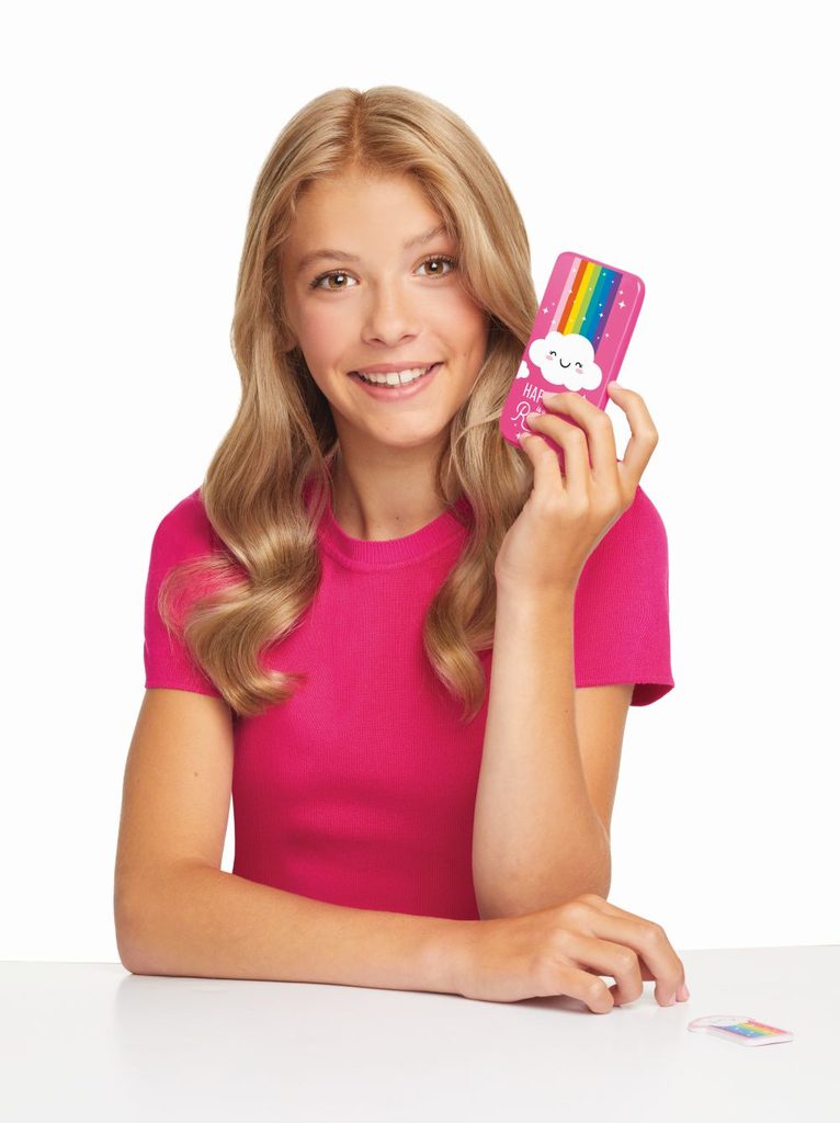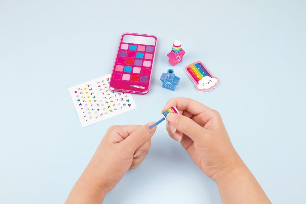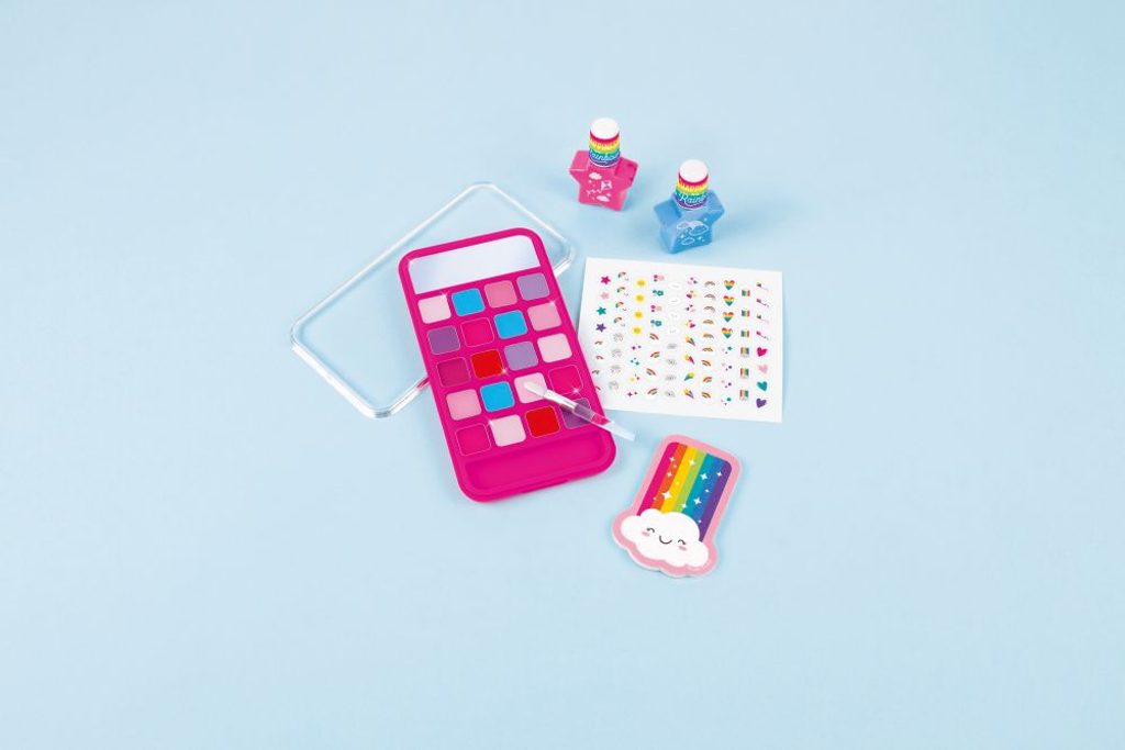 Paletka lesků na rty ve tvaru mobilního telefonu. Třpytivé aplikace, které můžete použít k tomu, abyste byly šik. Set obsahuje: 1 paletku lesků na rty s aplikátorem, 2 laky na nehty, 1 pilník na nehty a 1 arch samolepek na nehty. Baleno v krabici. Vhodné pro děti od 8 let.