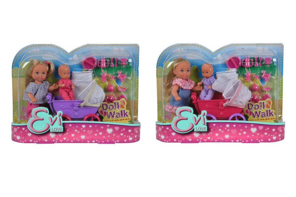 Panenka Evička na procházce s miminkem. Kočárek a další doplňky součástí. Výška panenek Evička 12 cm, mim