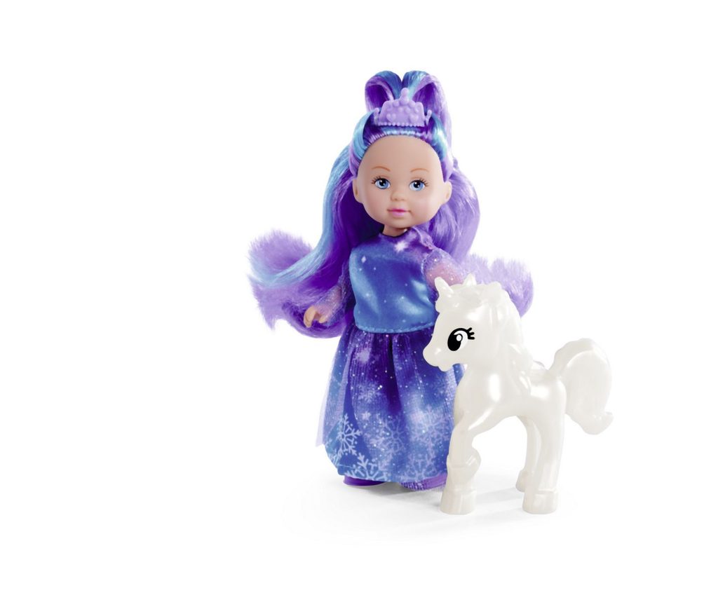 Panenka Evička jako Fantasy princezna v třpytivých šatech s bílým jednorožcem. Výška panenky 12 cm.