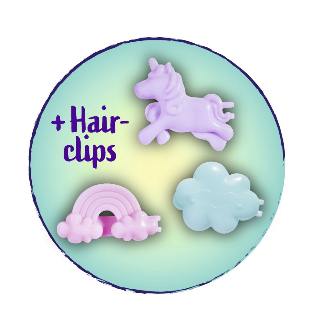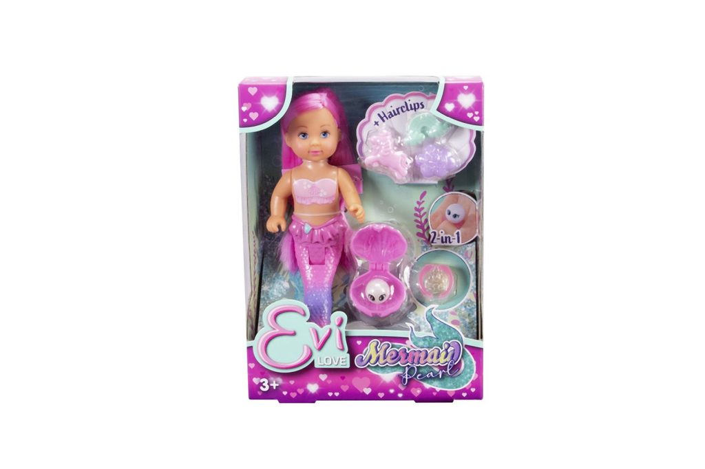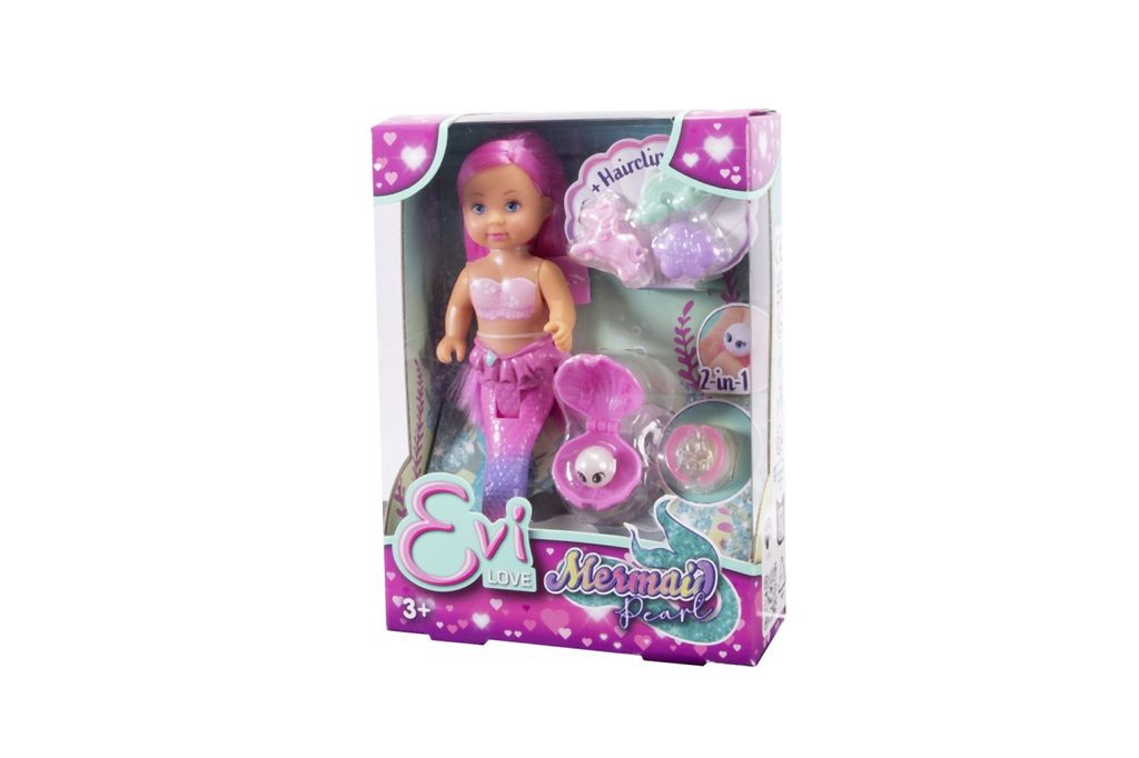 Panenka Evička mořská víla s dlouhými růžovými vlasy, se třemi klipy do vlasů (obláček, duha, jednorožec) a mušlí s perlou, kterou lze použít jako ozdobu prstenu (prstýnkový kroužek součástí balení). Velikost panenky 12 cm.