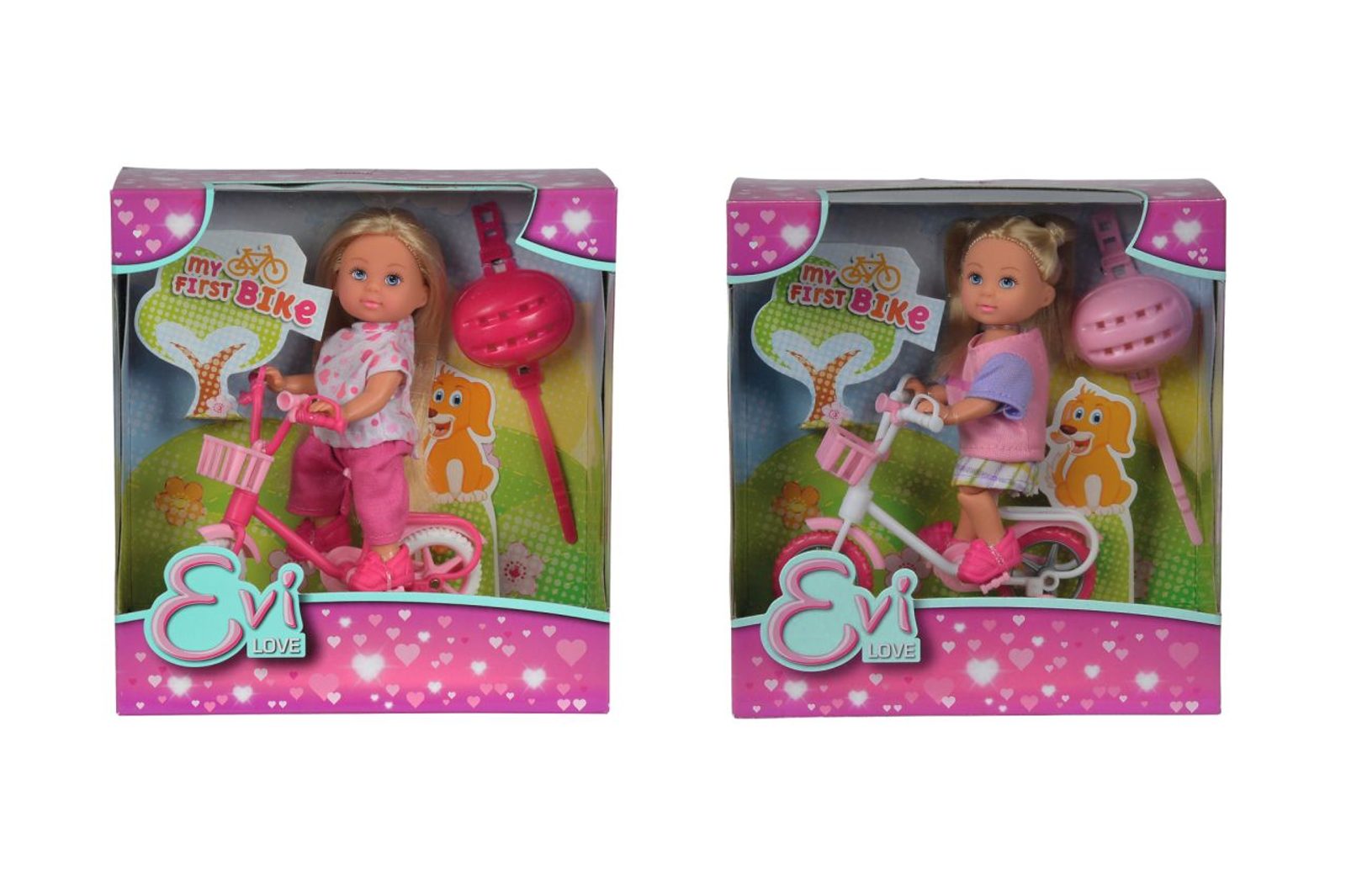 Panenka Evička na jízdním kole s balančními kolečky. Nechybí cyklistická helma ani láhev. Výška panenky 12 cm.