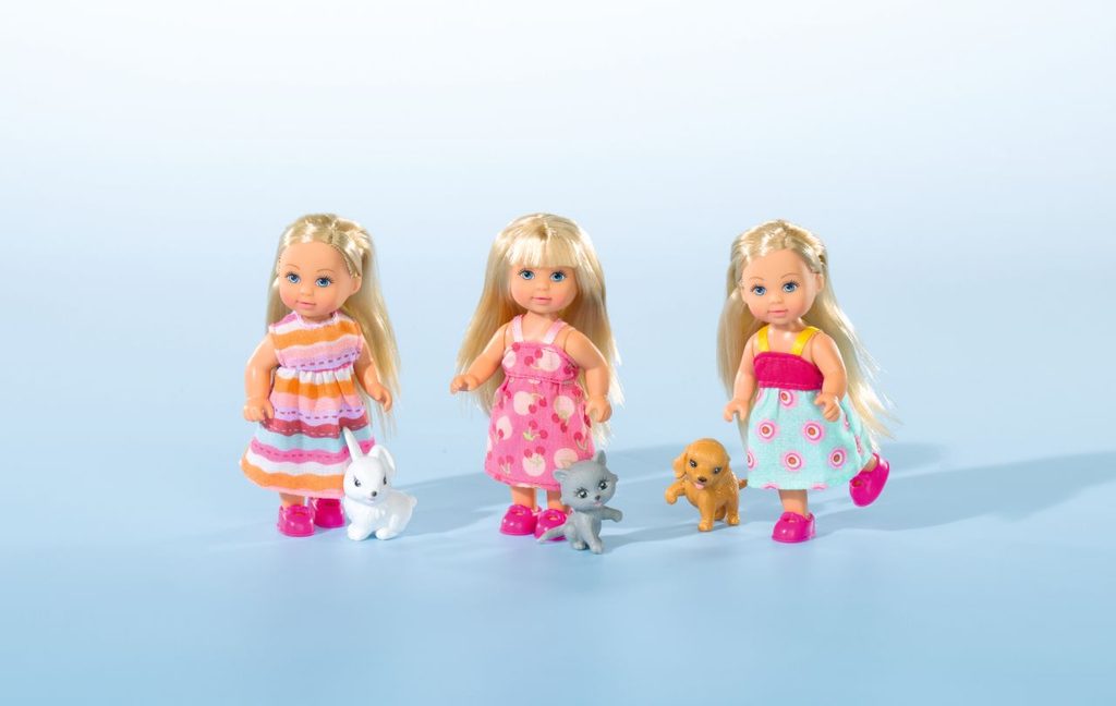 Panenka Evička má svého zvířecího mazlíčka. 3 druhy zvířátek: králíček, pejsek nebo kočička. Výška panenky 12 cm.