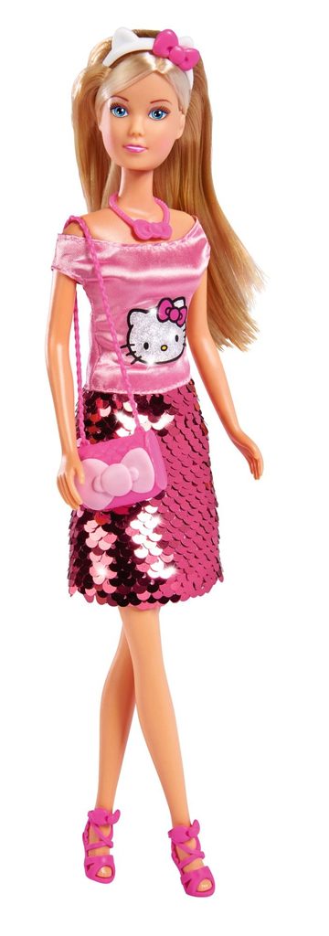 Panenka Steffi Hello Kitty, s flitrovou sukní se swap efektem. V příslušenství náhrdelník, čelenka a malá kabelka. Velikost panenky 29 cm.
