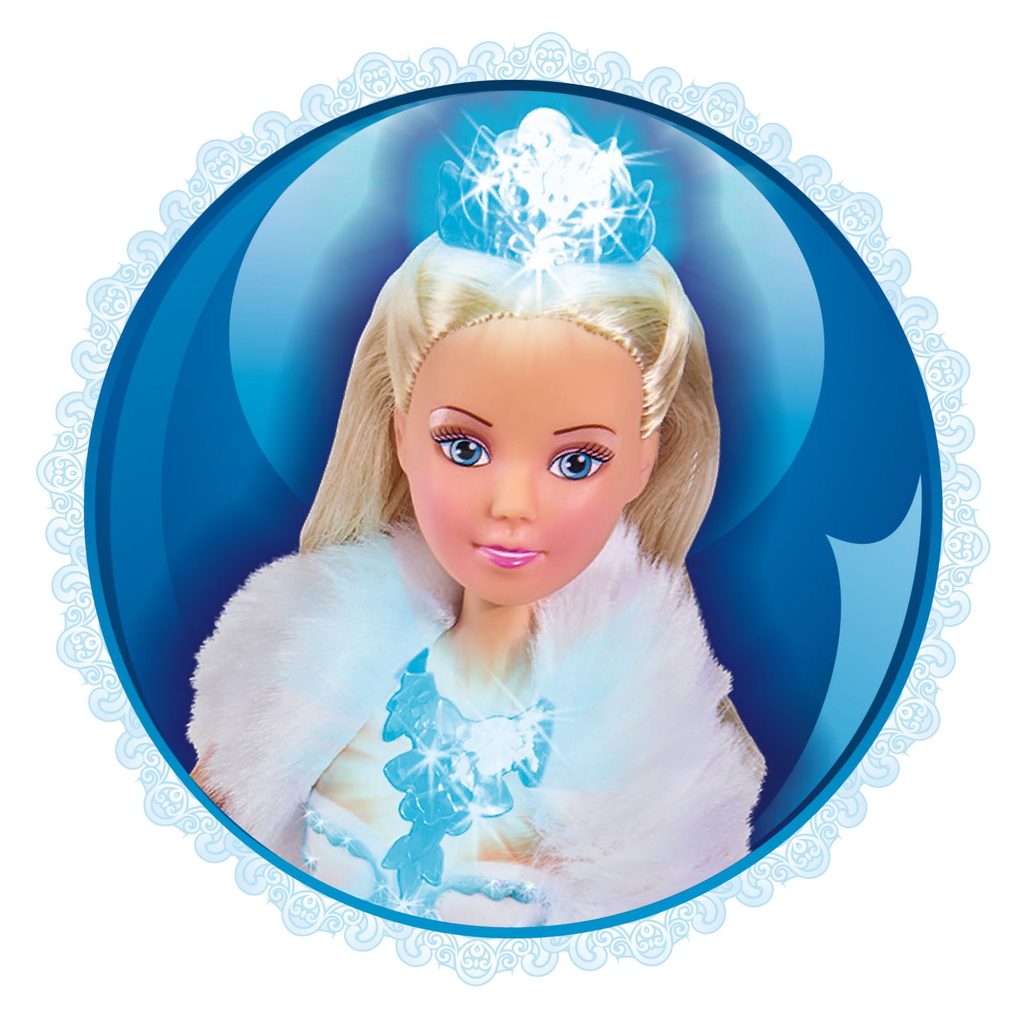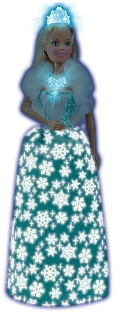 Panenka Steffi jako ledová princezna s magickou světelnou funkcí - tiara s náhrdelníkem svítí na baterie a vločky na sukni svítí/fosforeskují ve tmě. Velikost panenky 29 cm.