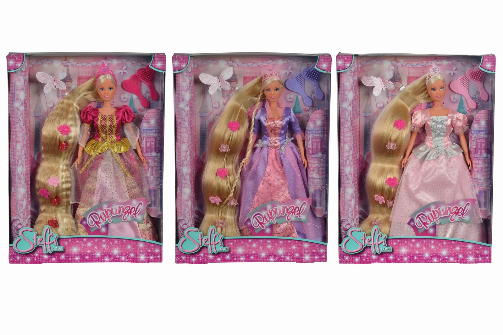 Princezna v krásných společenských šatech, s dlouhými vlasy.