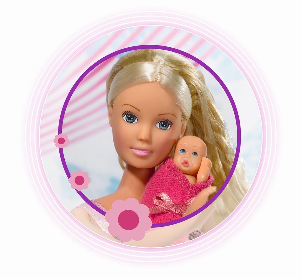 Panenka Steffi - těhotná, s miminkem v bříšku. Bříško panenky lze otevřít a vyndat malé miminko. Součástí 13 ks příslušenství pro miminko.