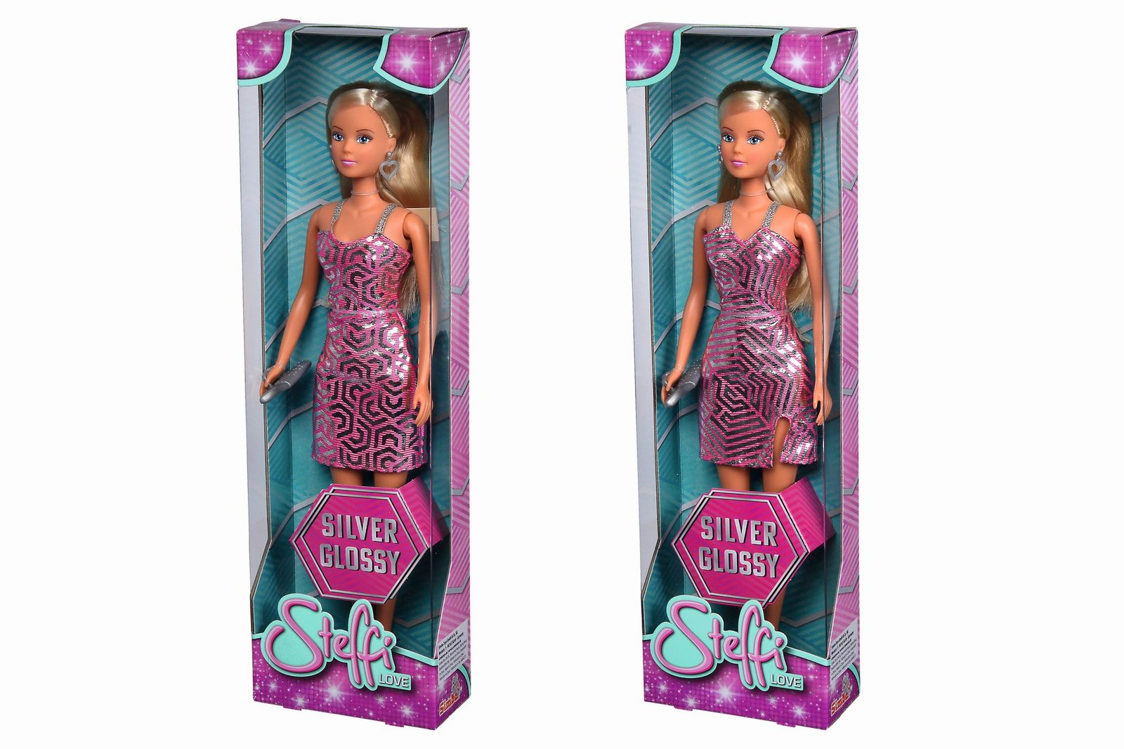 Panenka Steffi v efektních třpytivých šatech s náušnicemi a sponou, 2 druhy. Velikost panenky 29 cm.