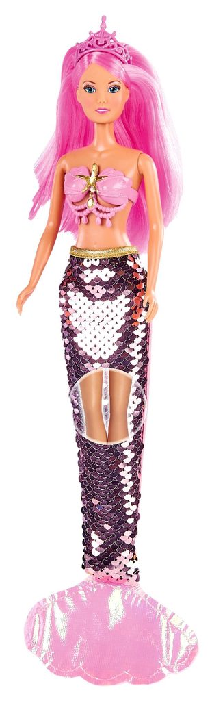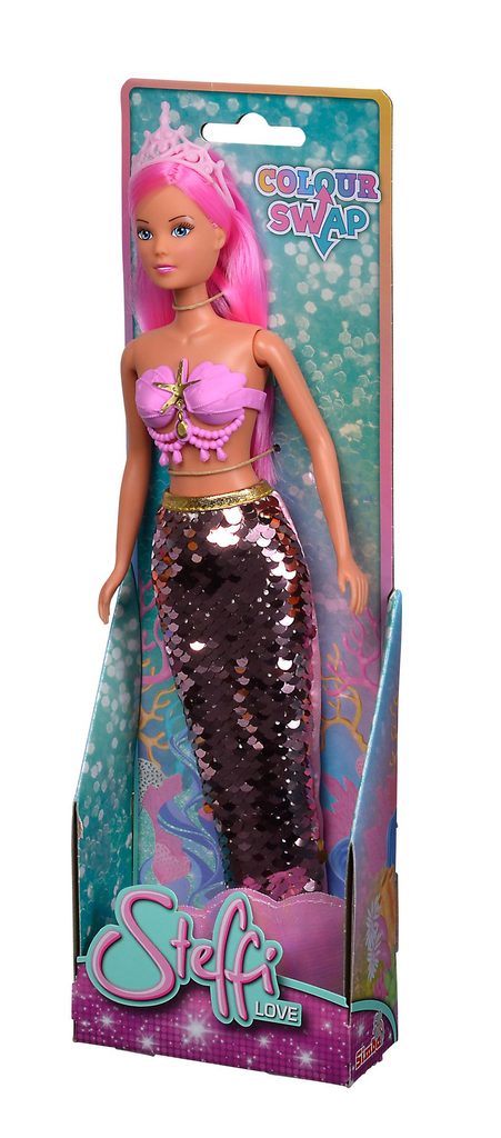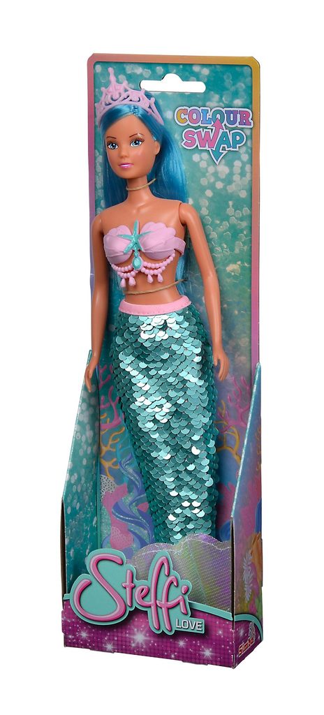 Panenka Steffi jako mořská panna s ploutví z barevných flitrů se swap efektem. Velikost panenky 29 cm.