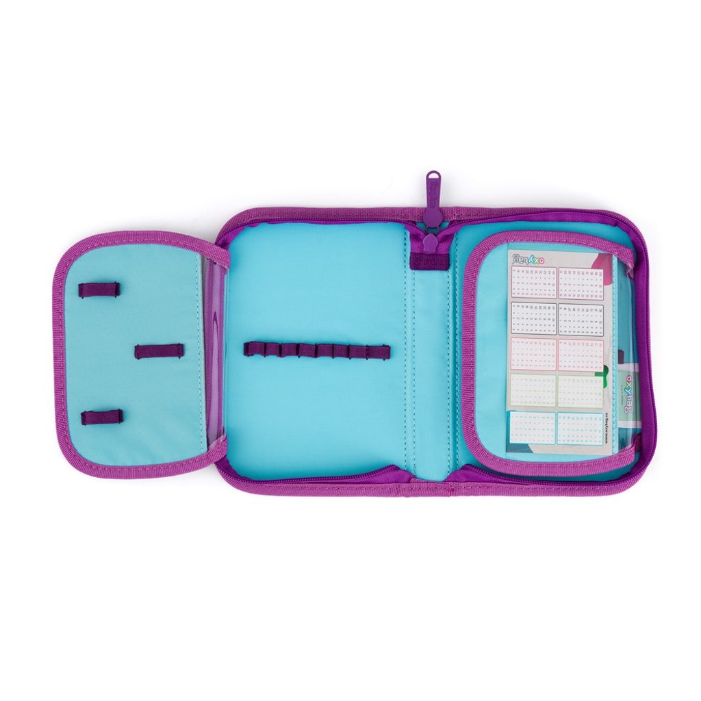 Jednopatrový školní penál s 2 chlopněmi, prázdný obsahuje 25 gumových poutek pro uchycení psacích potřeb. Na vnitřních chlopních jsou průhledné fólie pro rozvrh hodin.