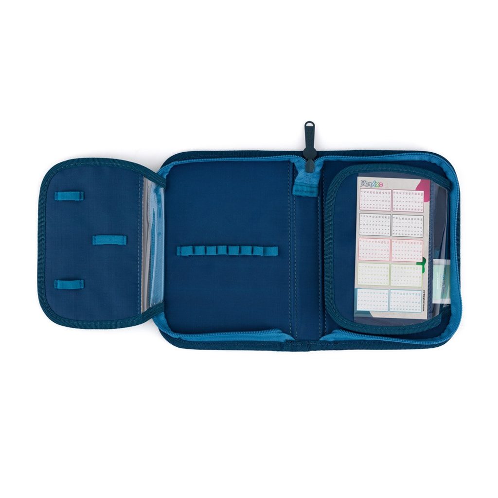 Jednopatrový školní penál s 2 chlopněmi, prázdný obsahuje 25 gumových poutek pro uchycení psacích potřeb. Na vnitřních chlopních jsou průhledné fólie pro rozvrh hodin.