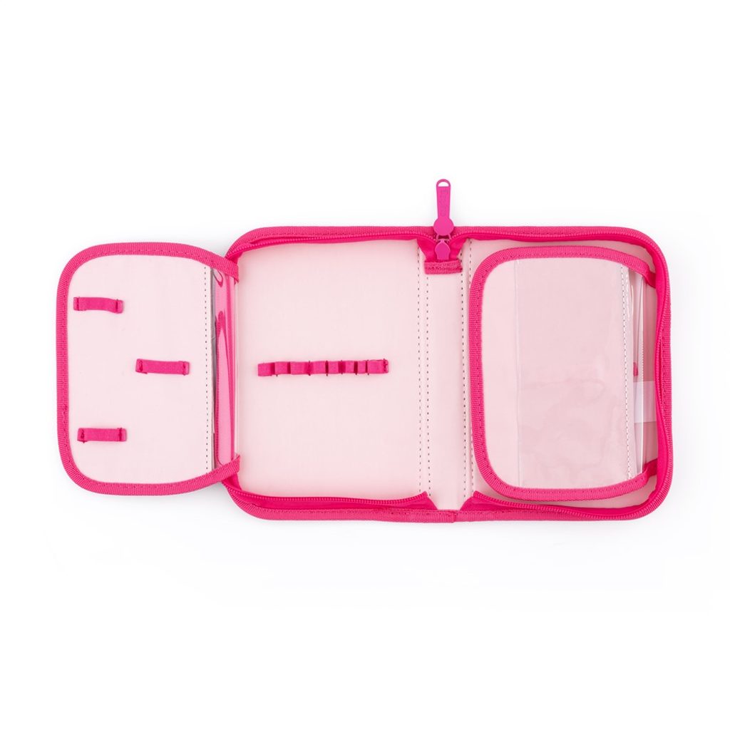 Jednopatrový školní penál s 2 chlopněmi, prázdný obsahuje 25 gumových poutek pro uchycení psacích potřeb. Na vnitřních chlopních jsou průhledné fólie pro rozvrh hodin.