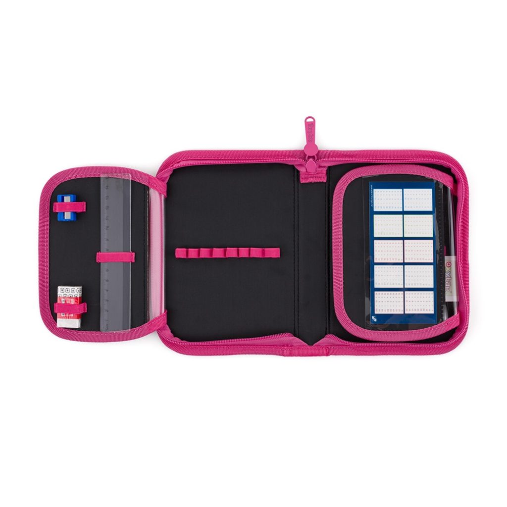 Jednopatrový školní penál s 2 chlopněmi, prázdný obsahuje 25 gumových poutek pro uchycení psacích potřeb. Na vnitřních chlopních jsou průhledné fólie pro rozvrh hodin.