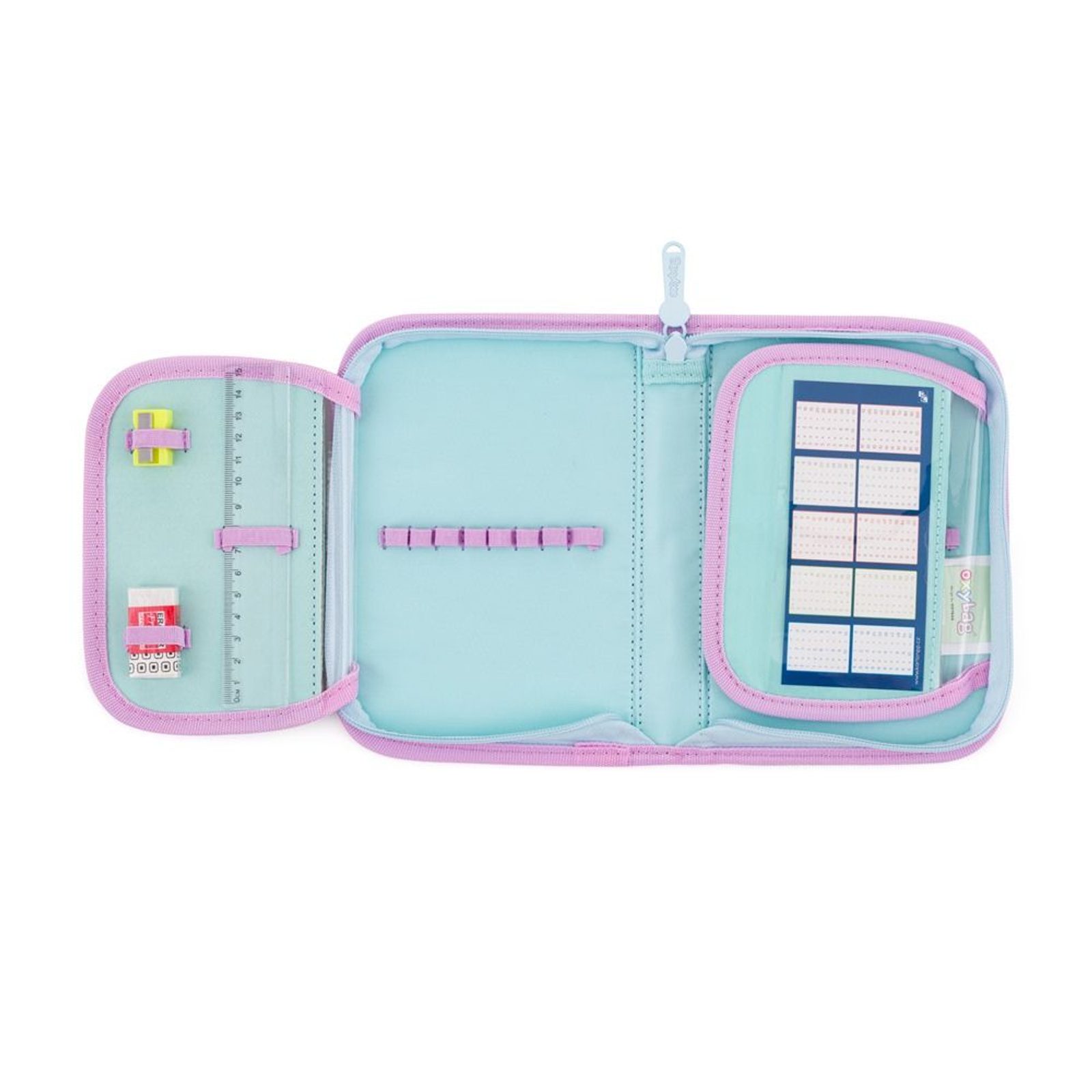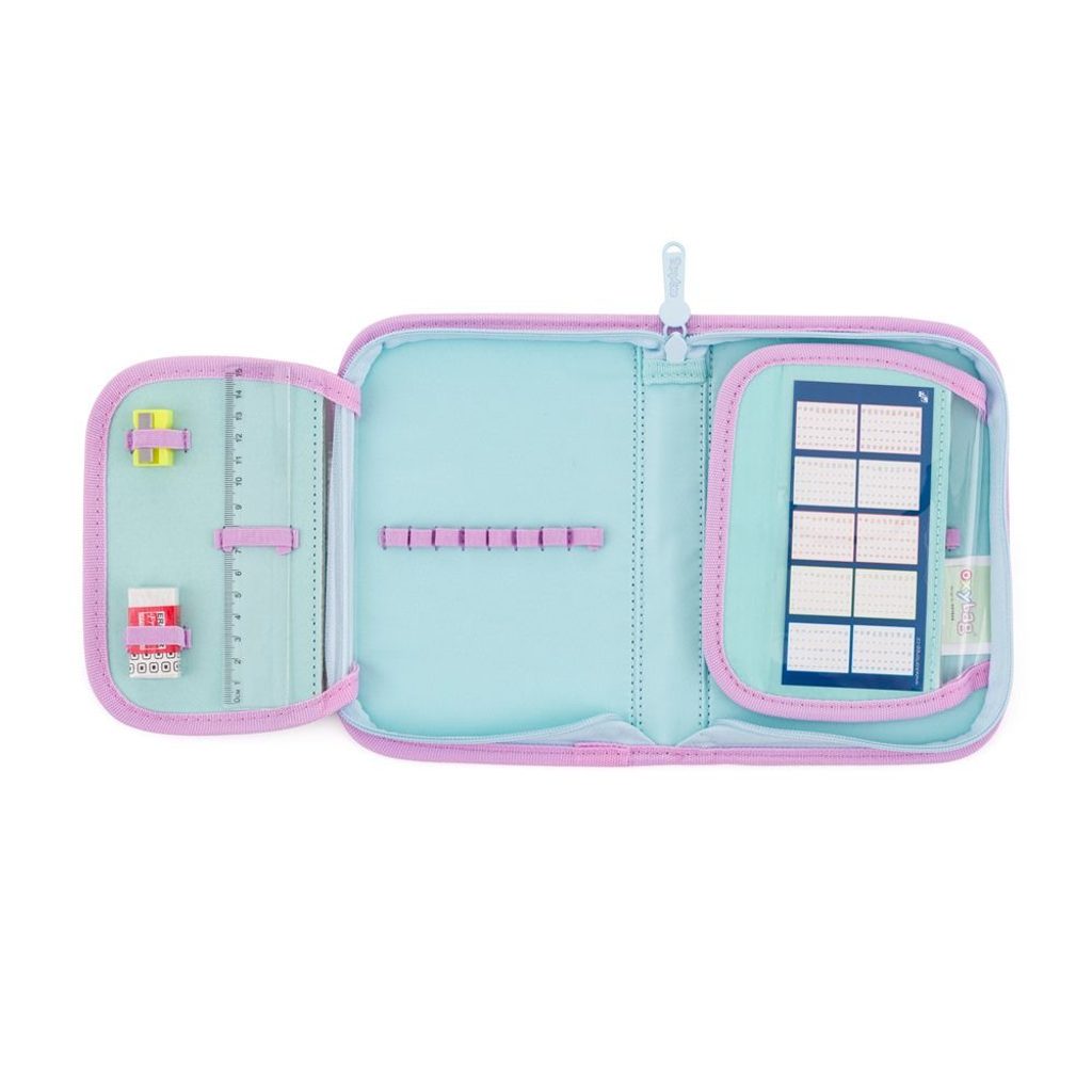 Jednopatrový školní penál s 2 chlopněmi, prázdný obsahuje 25 gumových poutek pro uchycení psacích potřeb. Na vnitřních chlopních jsou průhledné fólie pro rozvrh hodin.