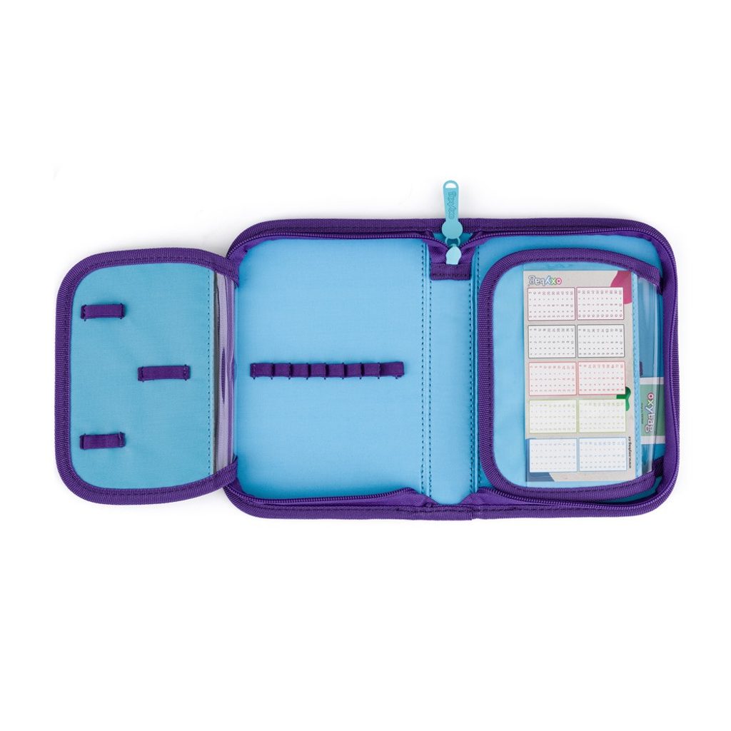 Jednopatrový školní penál s 2 chlopněmi, prázdný obsahuje 25 gumových poutek pro uchycení psacích potřeb. Na vnitřních chlopních jsou průhledné fólie pro rozvrh hodin.