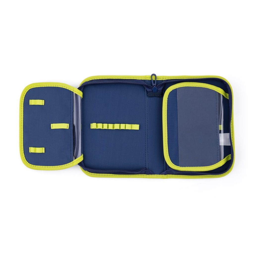 Jednopatrový školní penál s 2 chlopněmi, prázdný obsahuje 25 gumových poutek pro uchycení psacích potřeb. Na vnitřních chlopních jsou průhledné fólie pro rozvrh hodin.
