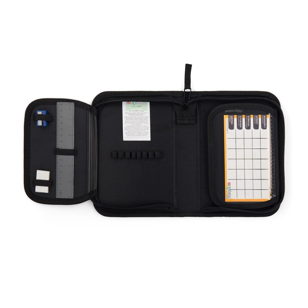 Jednopatrový školní penál s 2 chlopněmi řady UNICOLOR, prázdný obsahuje 25 gumových poutek pro uchycení psacích potřeb. Na vnitřních chlopních jsou průhledné fólie pro rozvrh hodin.