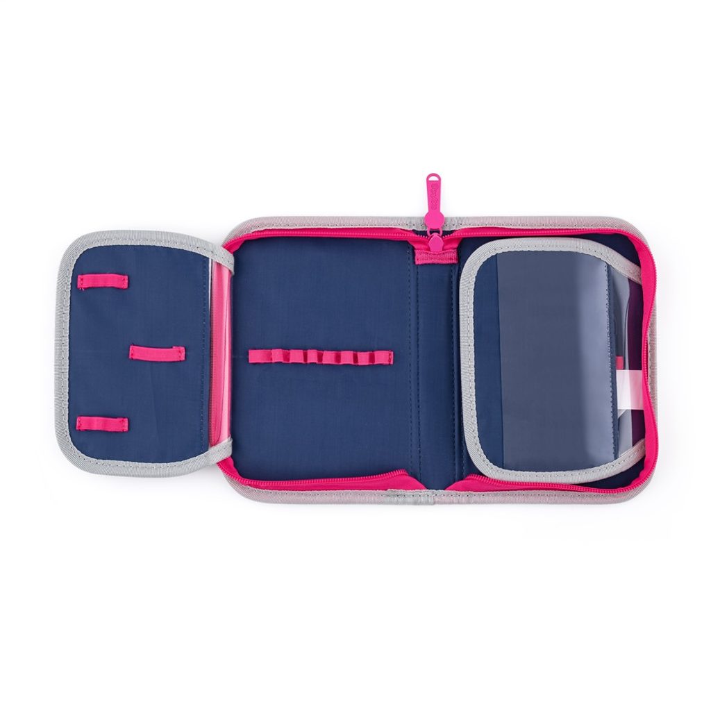 Jednopatrový školní penál s 2 chlopněmi, prázdný obsahuje 25 gumových poutek pro uchycení psacích potřeb. Na vnitřních chlopních jsou průhledné fólie pro rozvrh hodin.
