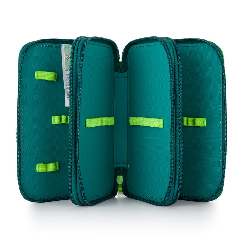 Školní penál třípatrový bez náplně. Penál obsahuje 41 gumových poutek pro uložení všech psacích potřeba a drobností potřebných k výuce. Penál má pevný zip s velkými taháčky pro snadnou manipulaci. Jedno patro je opatřeno průhlednou přihrádkou pro týdenní rozvrh.