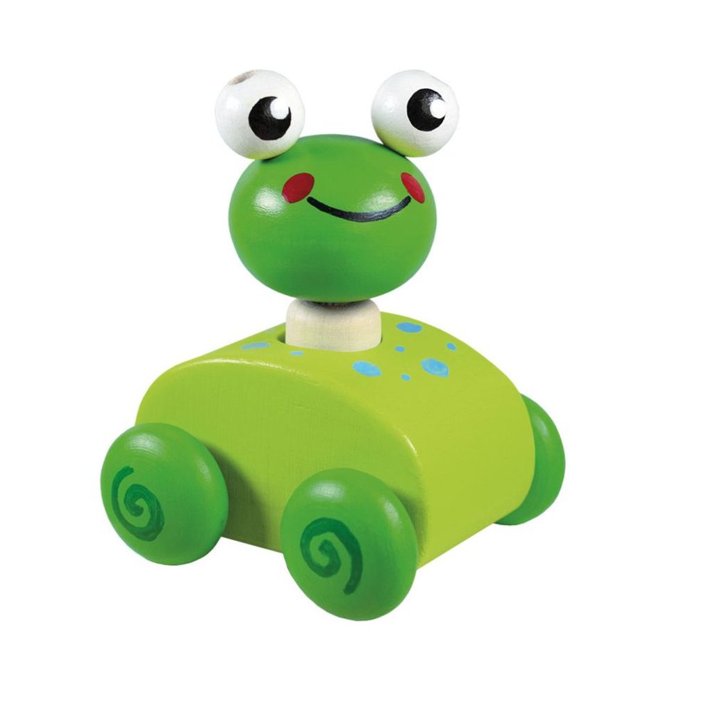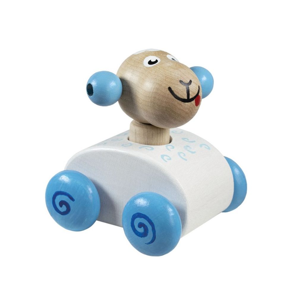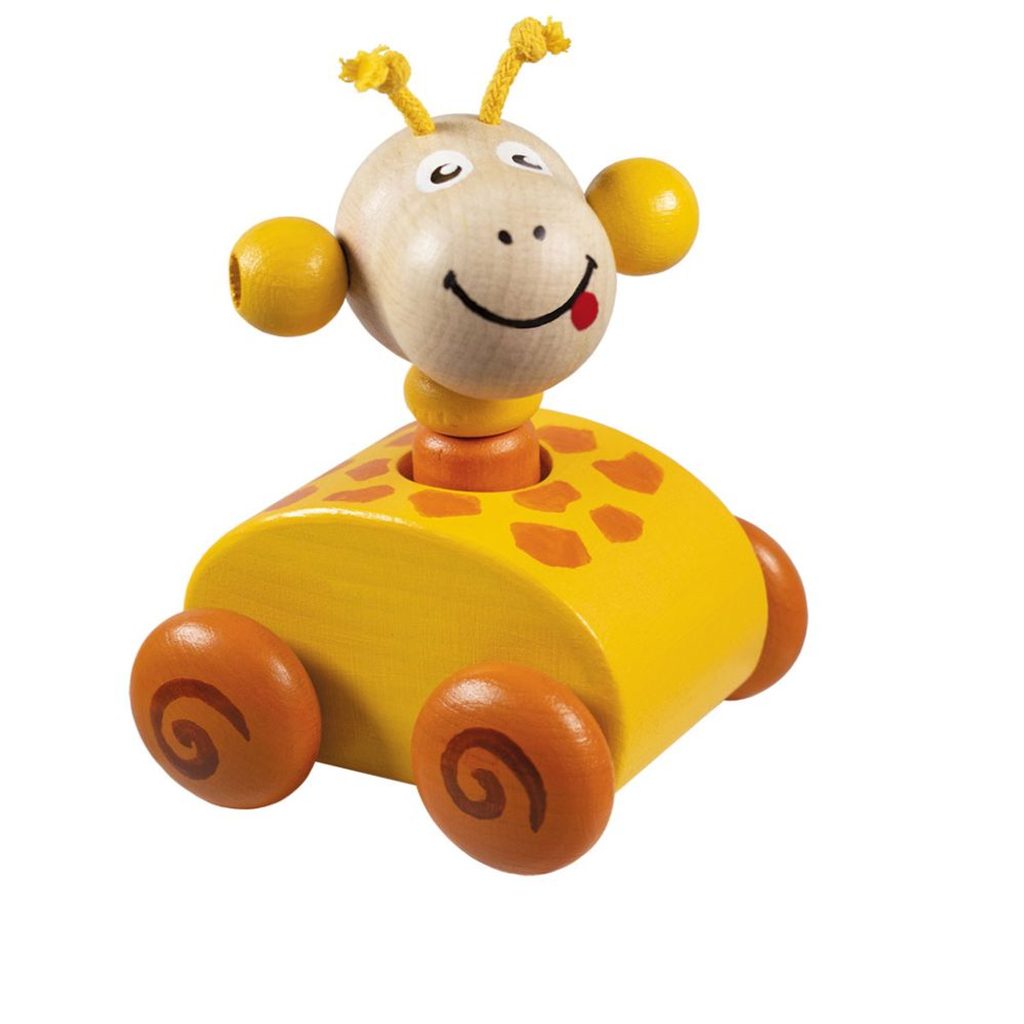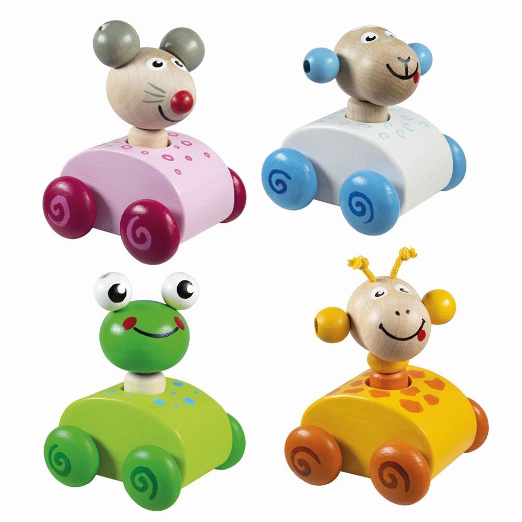 Dřevěná pískací zvířátka na kolečkách - série 4ks - žirafa, žabka, myška, ovečka. Při zmáčknutí zvířátka se ozve zapískání.