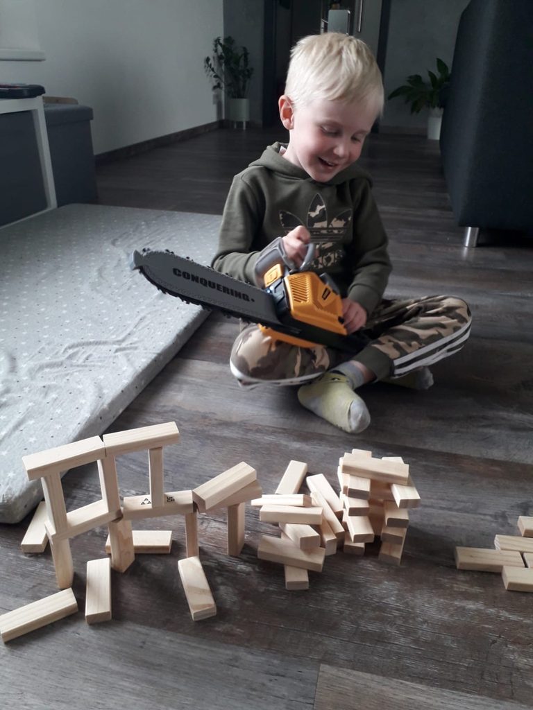 Motorová pila, která vydává zvuk řezání a svítí. Pilo rozvíjí dětskou motoriku a učí děti manuální práci.