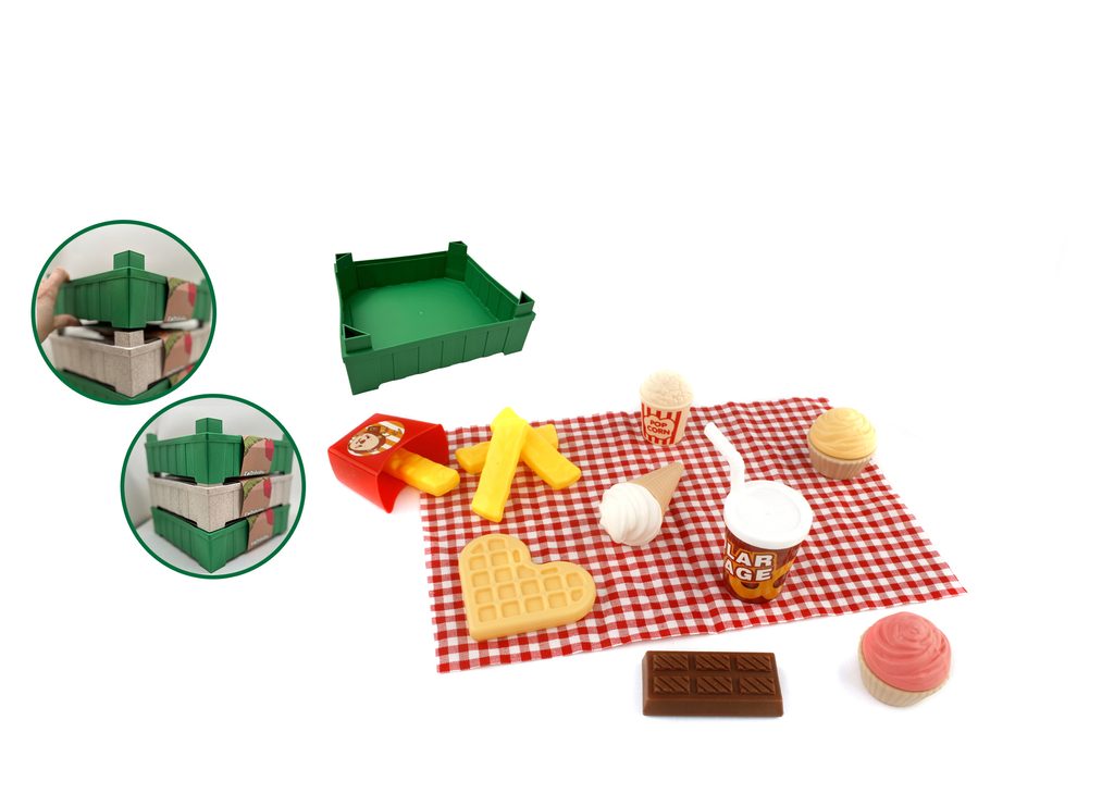 Zmrzlina, vafle, hranolky… a další pochutiny, které můžeš připravit pro své přátele. Udělej piknik pro své přátele. Potraviny jsou uložené v bedýnce, která jde skládat na sebe. Balení obsahuje 15 ks. Zmrzlina, vafle, hranolky… a další pochutiny, které můžeš připravit pro své přátele. Udělej piknik pro své přátele. Potraviny jsou uložené v bedýnce, která jde skládat na sebe. Balení obsahuje 15 ks.
