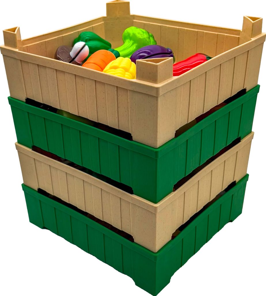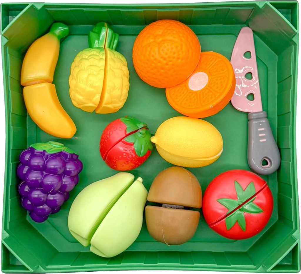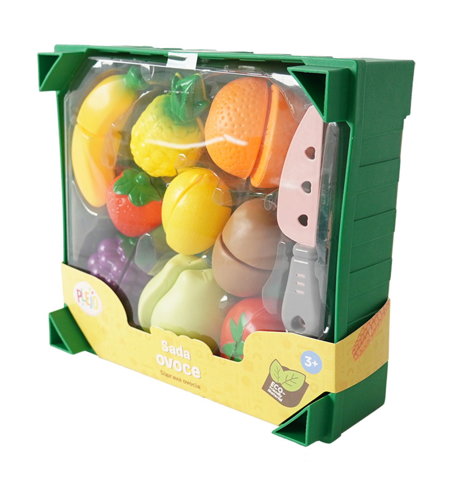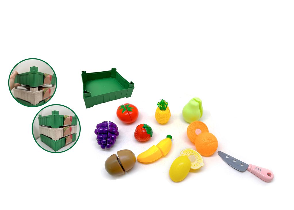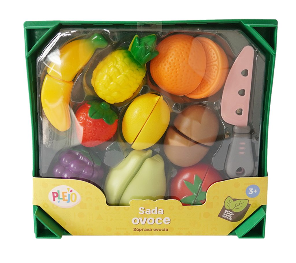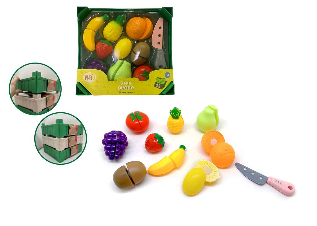 Sada ovoce v bedýce, která se dá skládat na sebe. Ovoce je na suchý zi a lze ho přiloženým nožem rozříznout. Sada obsahuje 19 ks.