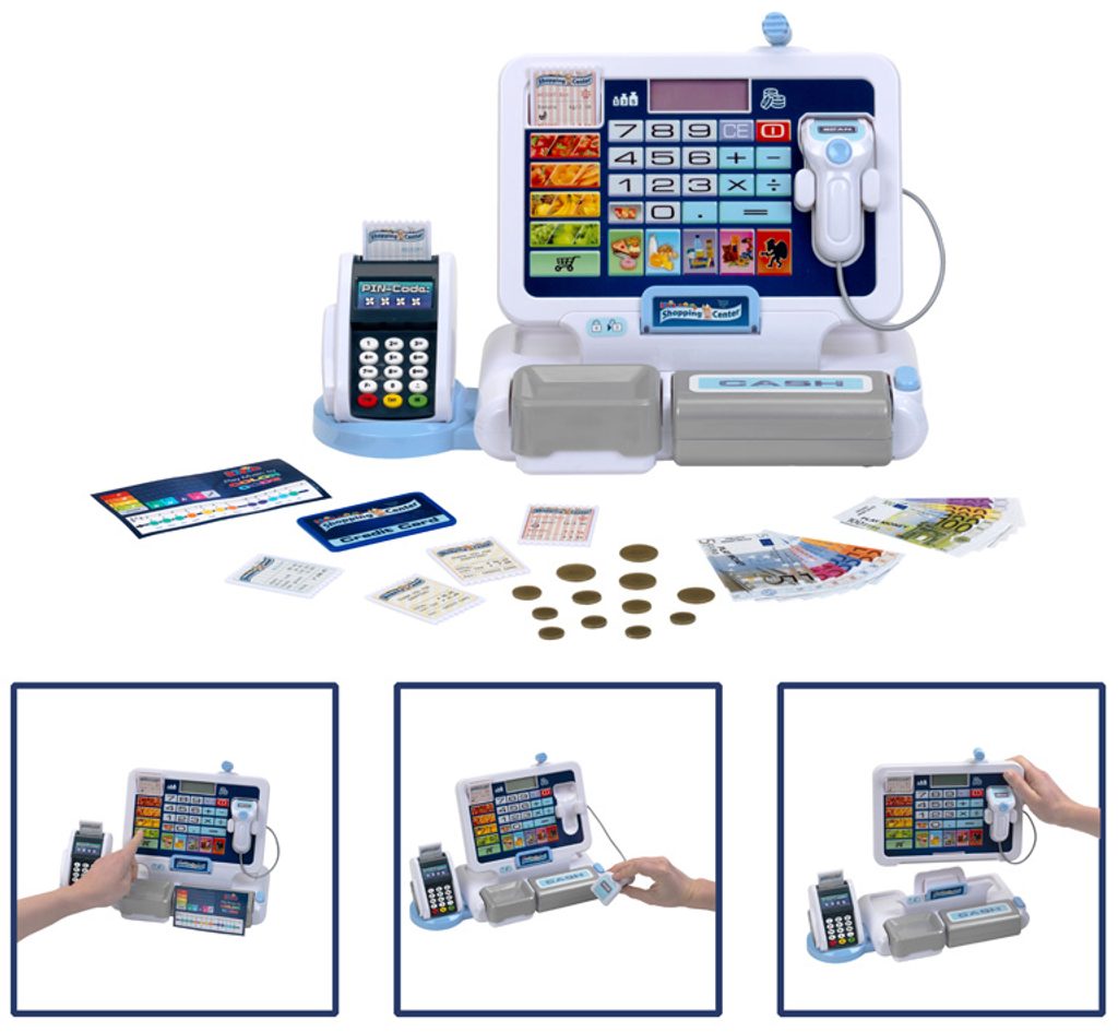 Pokladna s platebním terminálem a odnímatelným tabletem. Obsahuje Elektronický displej, zvukové efekty, funkce kalkulačky, skener se zvukem a výklopná peněžní přihrádka s tlačítkem. Obsahuje tyto doplňky: mince, bankovky, 6 příjmových karet a 1 kreditní kartu. Baterie nejsou součástí balení. Vhodné od 3 let.