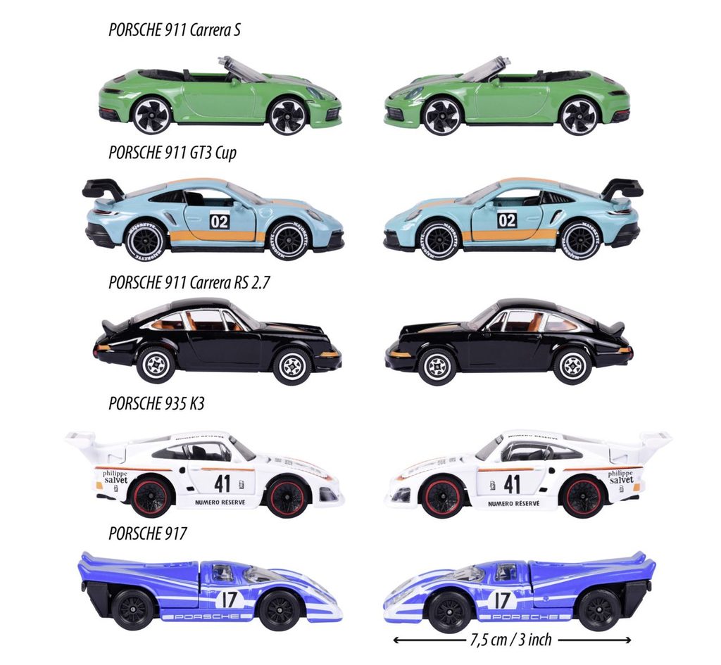 Dárková sada kovových sportovních autíček Porsche na volnoběh, délka 7,5 cm