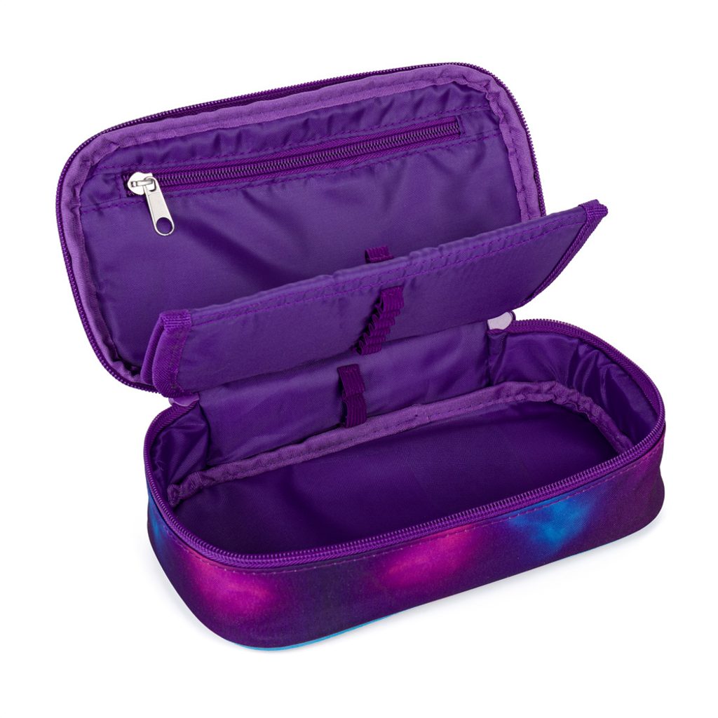 Školní pouzdro je opatřeno pevnými zipy, uzavíratelnou kapsičkou na zip, přihrádkou na pravítko a klopou s šesti poutky na psací potřeby. Pod klopou je místo pro volné uložení psacích potřeb nebo jiných drobností. Vhodné pro školáky na 2. stupni a starší studenty.