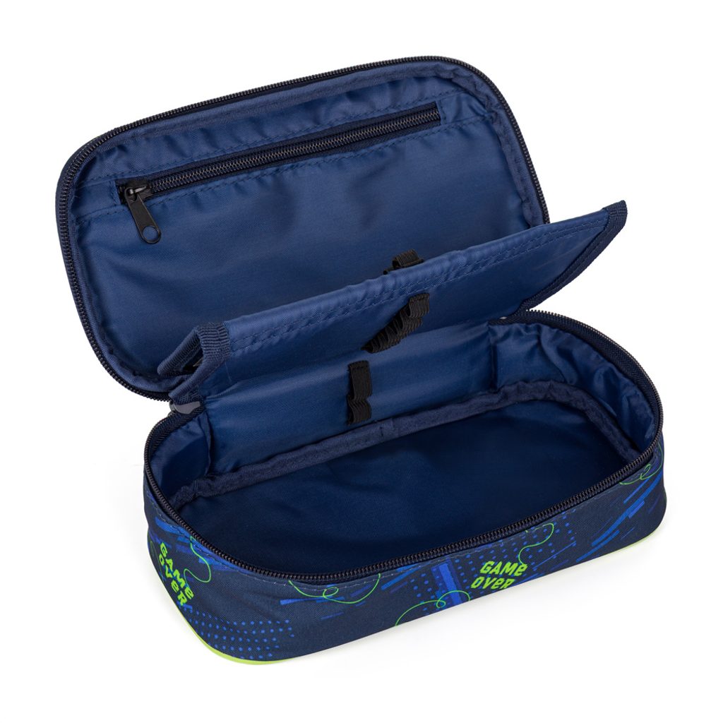 Školní pouzdro je opatřeno pevnými zipy, uzavíratelnou kapsičkou na zip, přihrádkou na pravítko a klopou s šesti poutky na psací potřeby. Pod klopou je místo pro volné uložení psacích potřeb nebo jiných drobností. Vhodné pro školáky na 2. stupni a starší studenty.