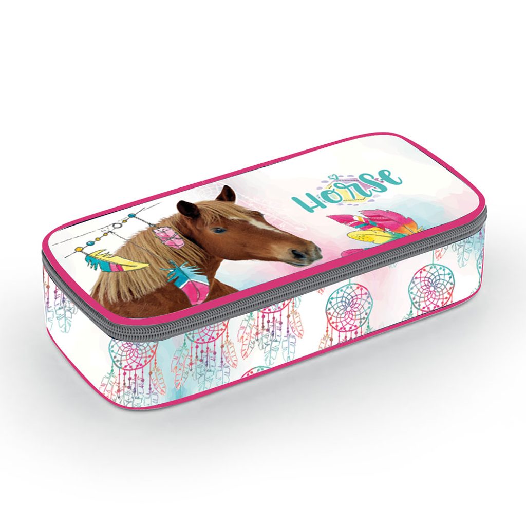Školní pouzdro etue s motivem koně. Pouzdro je opatřeno pevnými zipy, kapsičkou na zip a klopou s pevnými poutky po obou stranách. Pod klopou je místo pro volné uložení psacích potřeb nebo jiných drobností. Vhodné pro školáky na 2. stupni a starší studenty.